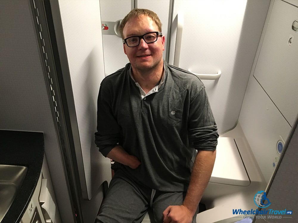 On longer transcontinental or international flights, “holding it” may not be possible, and you may have to use the onboard aisle chair to access the airplane lavatory.