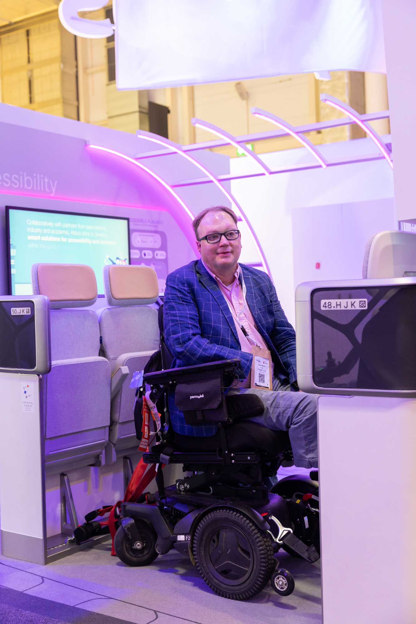I visited the Airbus stand at AIX and secured my Permobil F3 power wheelchair inside the full-scale mockup of the company's Airspace U Suite. Until now, the U Suite has been just a digital rendering, but at AIX it became tangible. Developed over several years by Airbus engineers Hans-Gerhard Giesa and Dirk Meiranke, the concept's prime position at AIX is evidence of just how seriously the aircraft manufacturer is considering the inclusion of wheelchair users in its designs for the next generation of passenger air travel.