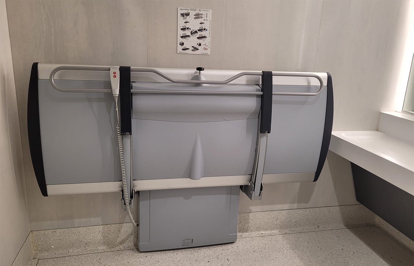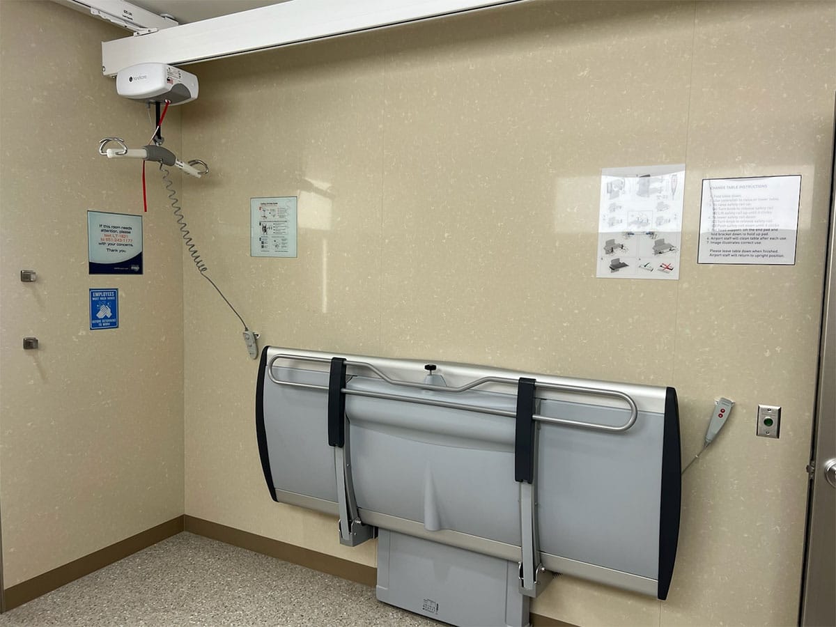 During a recent renovation of the family restroom in the North Satellite Terminal, an adult changing table was installed. The facility is located near gate N20, and features a height-adjustable table.