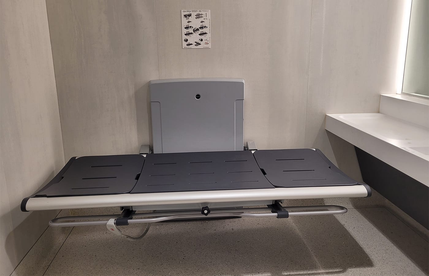 Today, there are 12 adult changing stations throughout the Phoenix Airport. They are of a fixed-height design, shaped like a bed, and have grab bars along the adjacent walls.