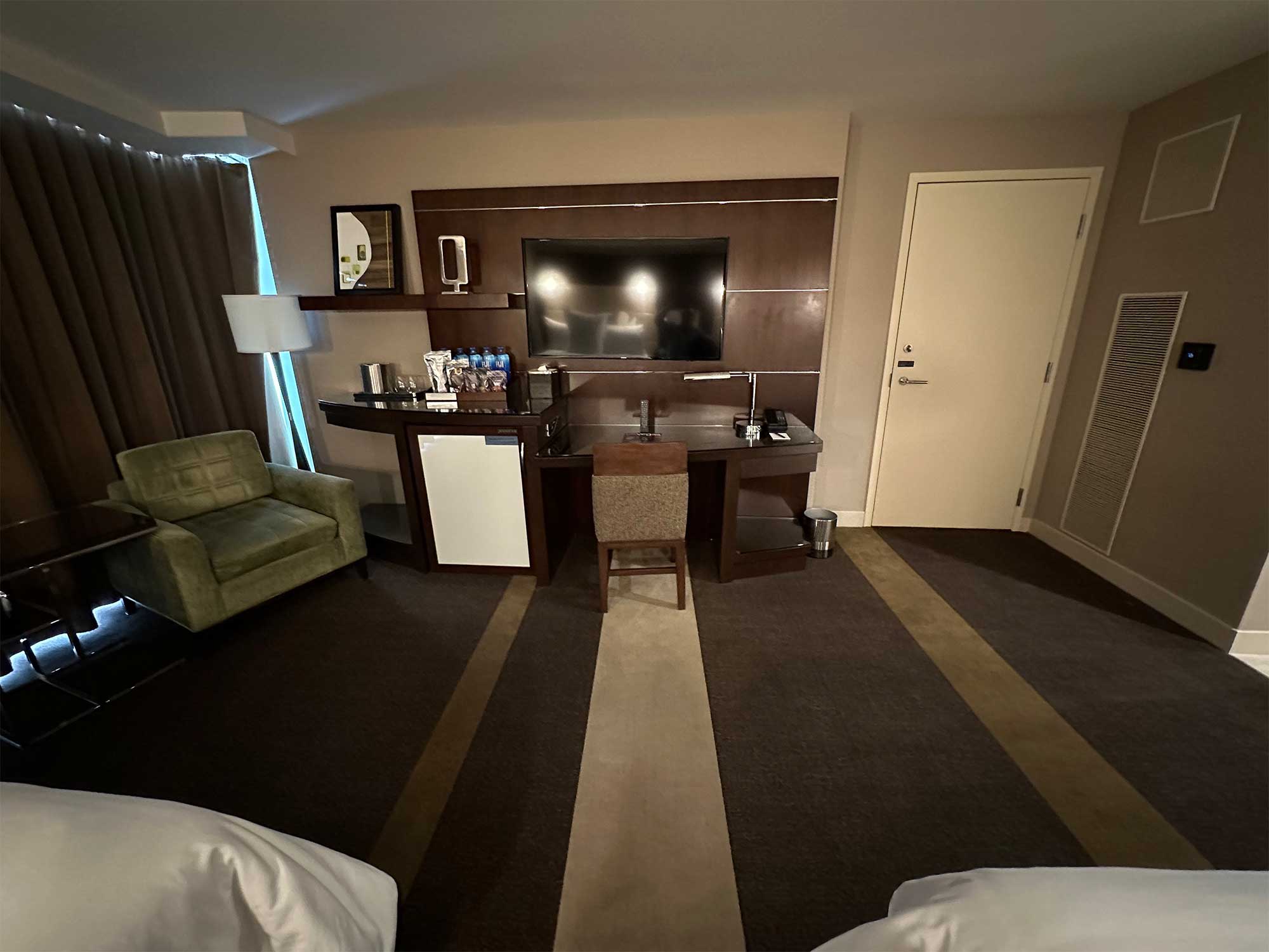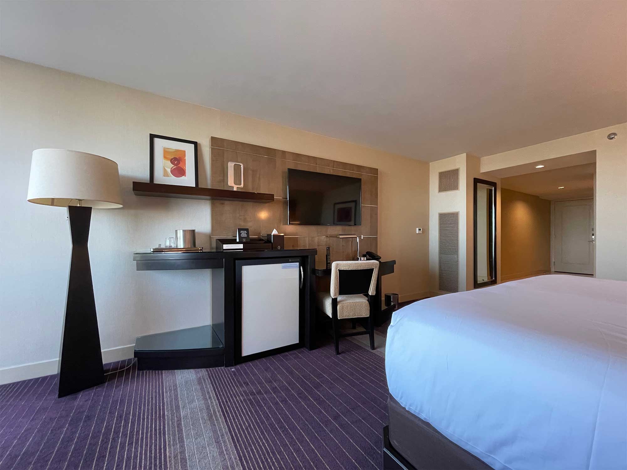 Across the room, a flat screen TV was mounted to the wall above a desk, which measured 31 inches from the floor to the tabletop, with 28 inches of clearance underneath. There was a minibar and chair located in that portion of the room as well.