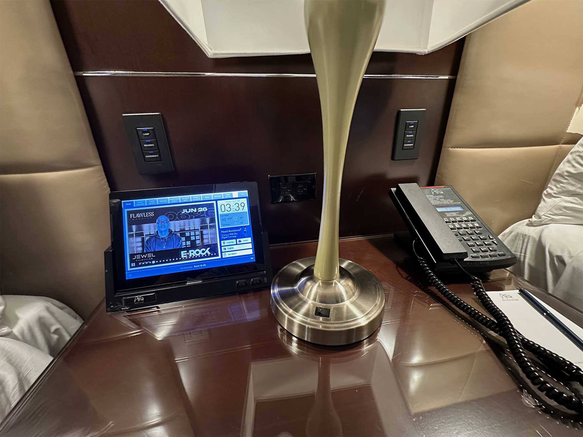 A telephone, lamp, and tablet device were accessible on the nightstand between the beds. Using the tablet, I was able to control the lighting and window shades, while performing other functions including ordering room service and researching property information (restaurant hours, spa services, etc.). There were power outlets installed behind the lamp, which I used to charge my power wheelchair and electronic devices.