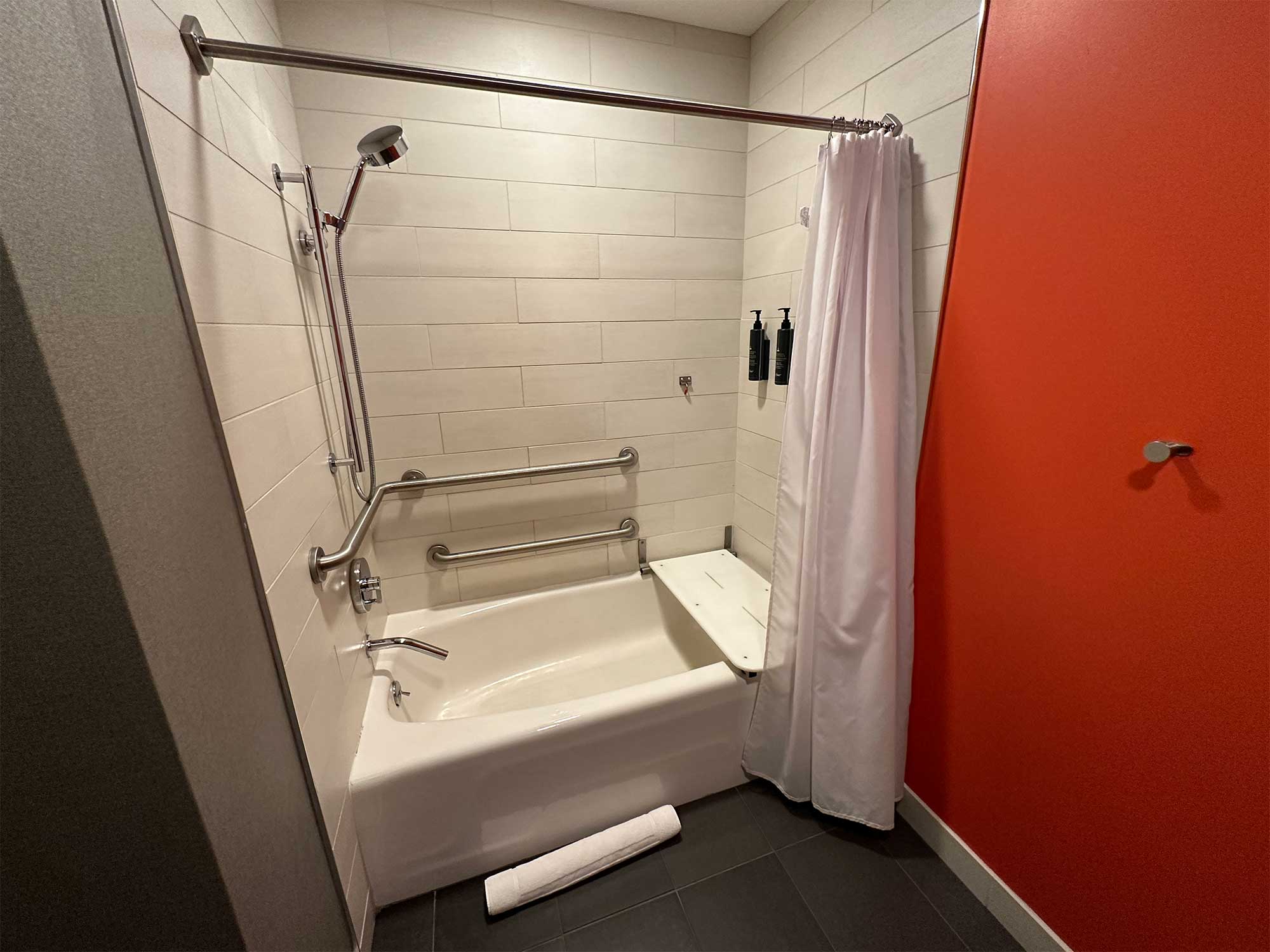 During my stay at this hotel, my room had two queen beds and an ADA accessible bathtub. The tub featured one of two approved designs in the ADA Standards for Accessible Design, featuring a seat behind the tub basin, grab bars and a handheld showerhead. For more information on this hotel or to book a room, visit the hotel website.