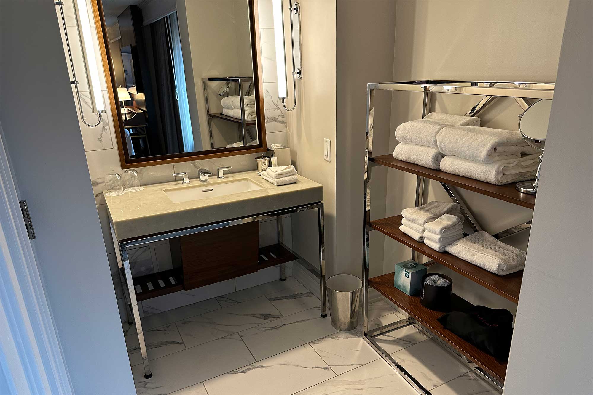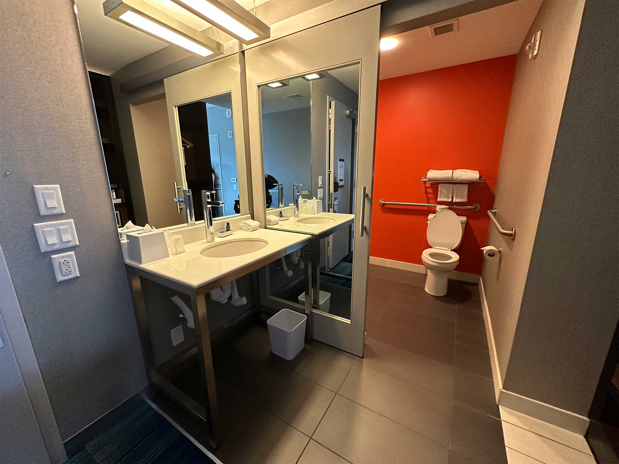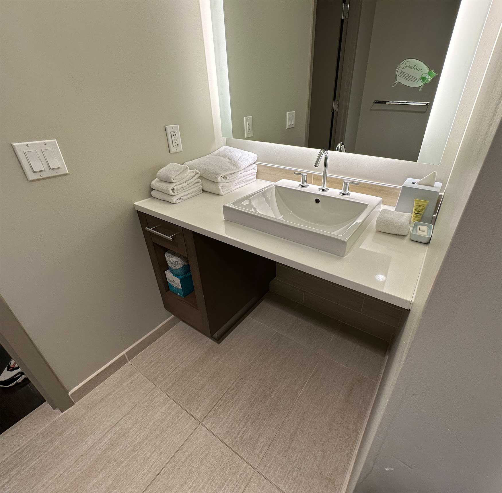 Each accessible guest room at the Element hotel has a transfer shower, which differs from a roll-in shower in that it is three feet square. Wheelchair users can transfer onto the securely attached shower seat, benefitting from grab bars on the adjacent walls and water controls within easy reach. The transfer shower is my favorite accessible shower type. The Element ADA accessible bathrooms also feature a roll-under sink.