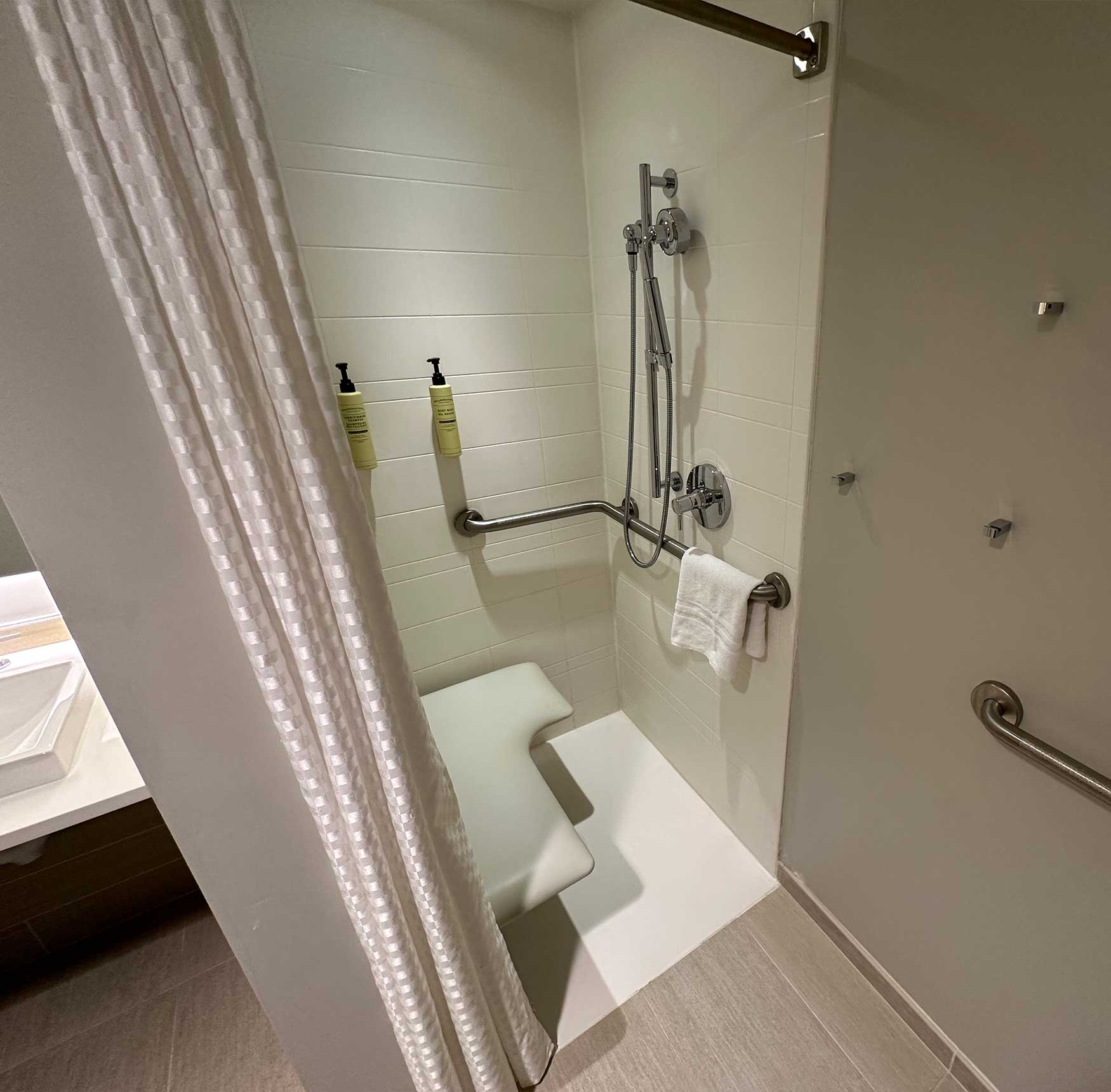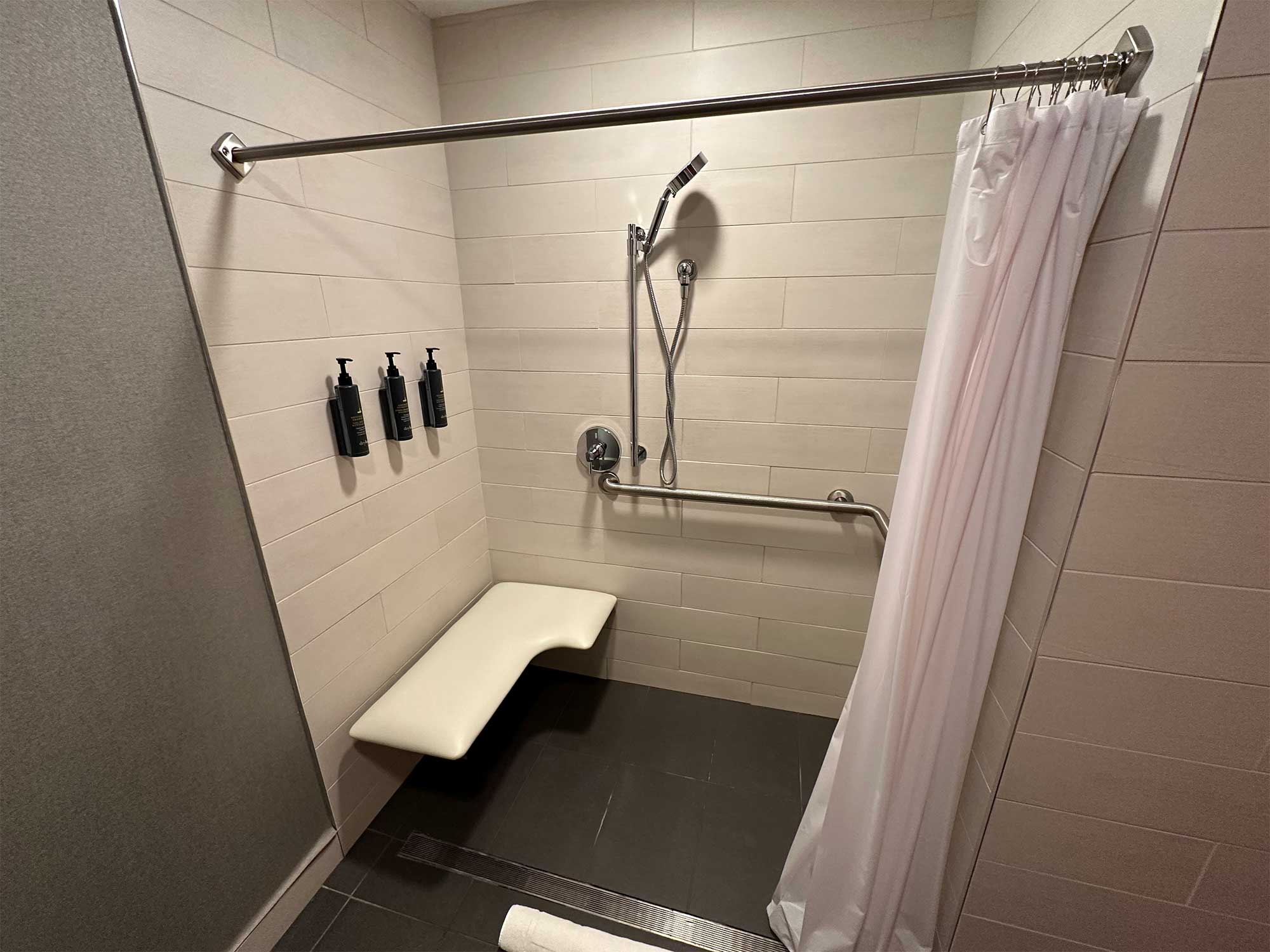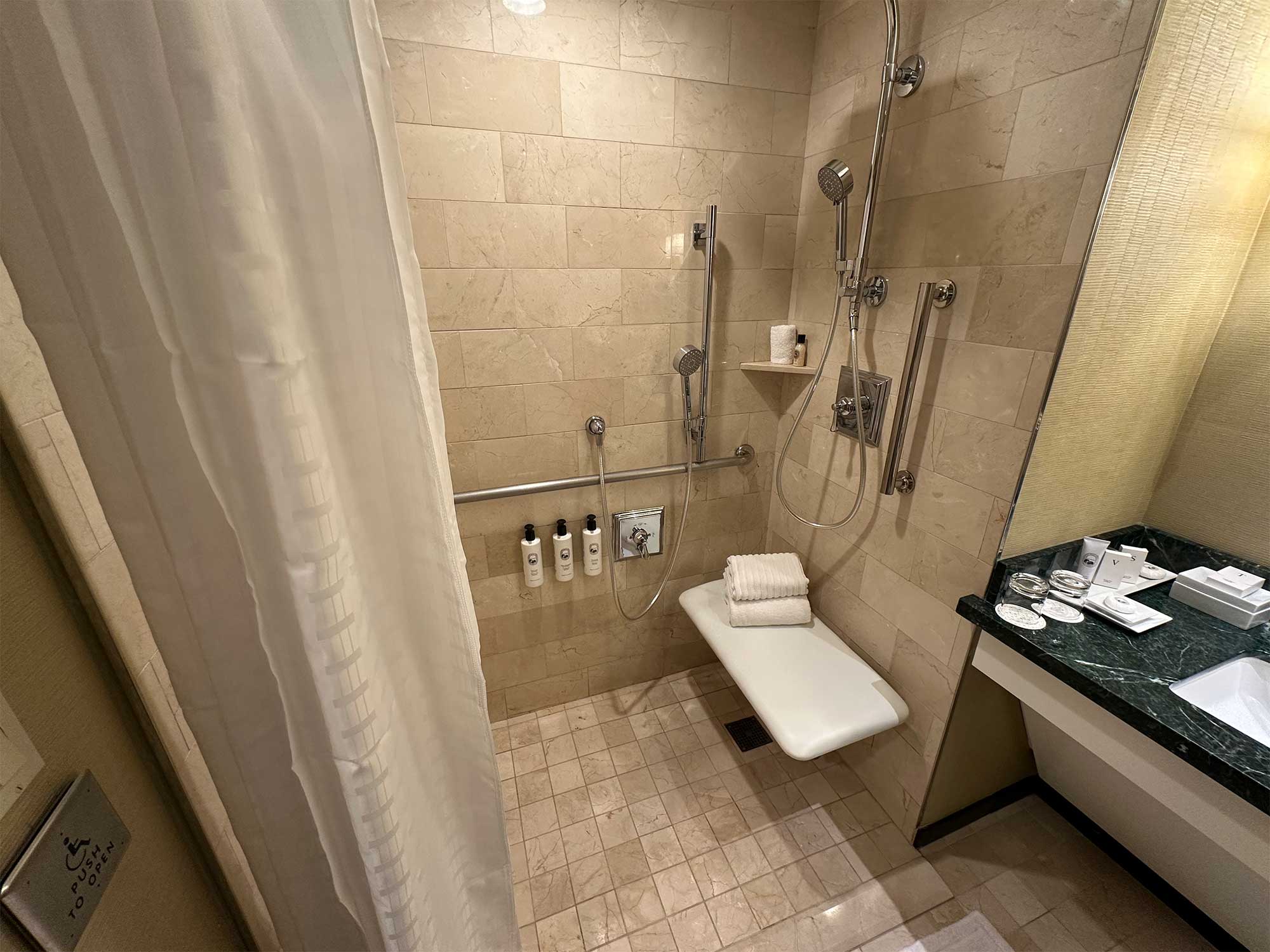 ADA accessible bathtubs have a securely mounted seat at the head of the tub, parallel grab bars along the back wall and a handheld shower head. Rooms with roll-in showers feature a folding seat securely attached to the wall, grab bars and a handheld spray unit. In both the shower and the tub, soap and shampoo are available from dispensers mounted behind the seat — I shared feedback with the hotel and hope they will relocate those dispensers to a more accessible location.