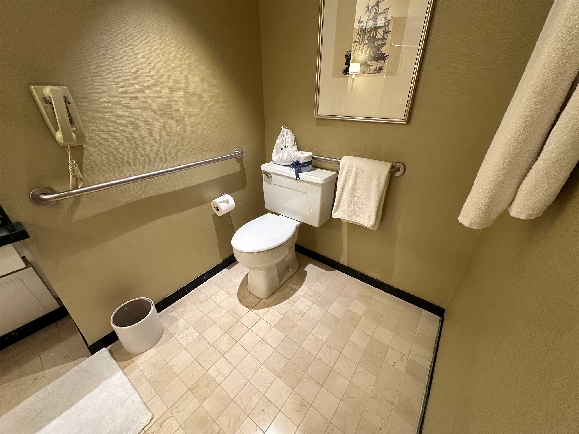 The high level of accessibility continues into the bathroom, with roll-under sinks, toilets with grab bars, and roll-in showers with folding seats securely attached to the wall. Of all the Boston hotels that I have seen, this hotel on Long Wharf is at the top of the list for accessibility.