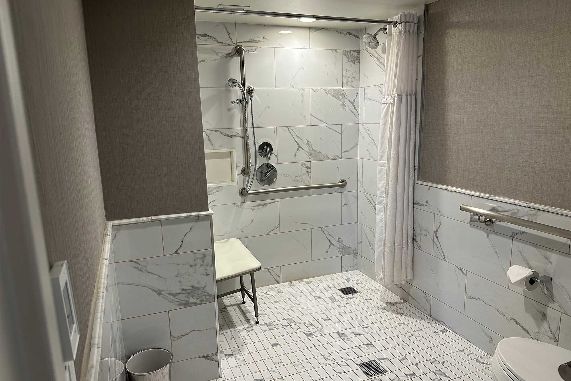 The guest rooms are spacious and feature ADA accessible bathrooms with the required accessibility features, including a roll-in shower with a wall-mounted shower seat and grab bars. For more information or to book a room, visit the hotel website.