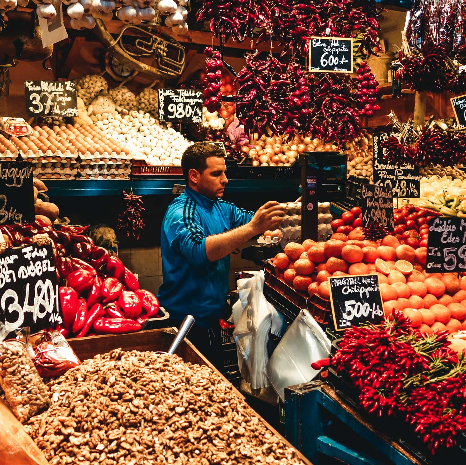 The market’s three levels offer a variety of goods, with stalls on the ground floor selling the most popular products of meat, produce, spices, wine and spirits. The basement level features fish and vegetables, while the second floor is home to restaurants/eateries and tourist souvenirs.