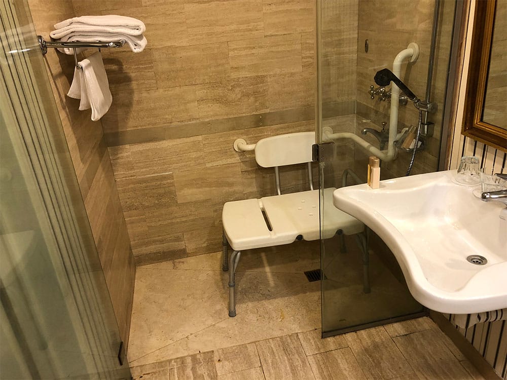 The guest room was spacious, but the bathroom was cramped. It was a challenge to access the roll-in shower, which has a glass door. The door can be removed by the hotel’s maintenance department, which will make things easier – but at the risk of soaking the bathroom floor. If you can get this hotel for a good price, the location is superb.