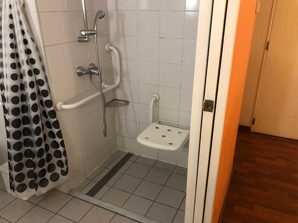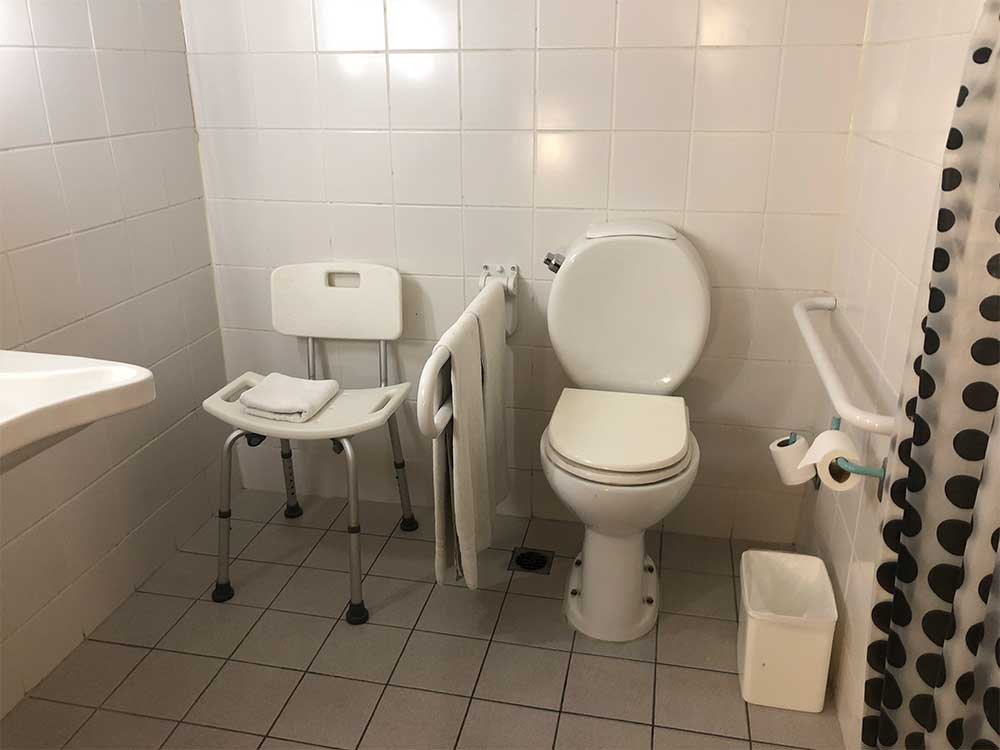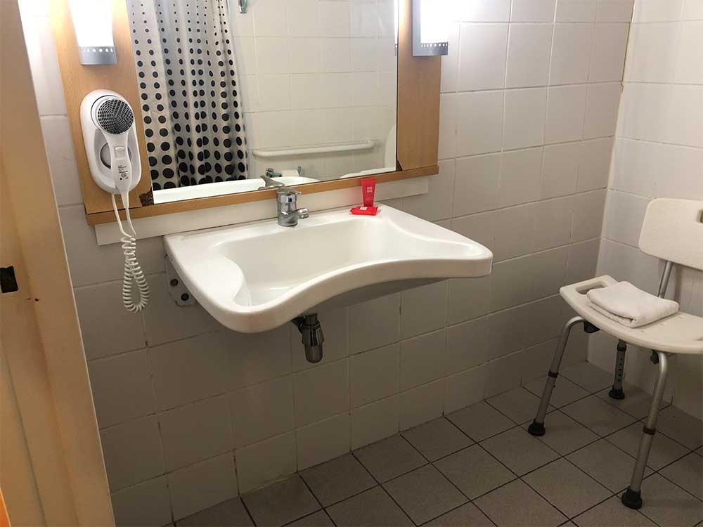 For about $30 per night, you can reserve one of the hotel’s 3 wheelchair accessible rooms, with a roll-in shower and toilet with grab bars. These are the measurements: