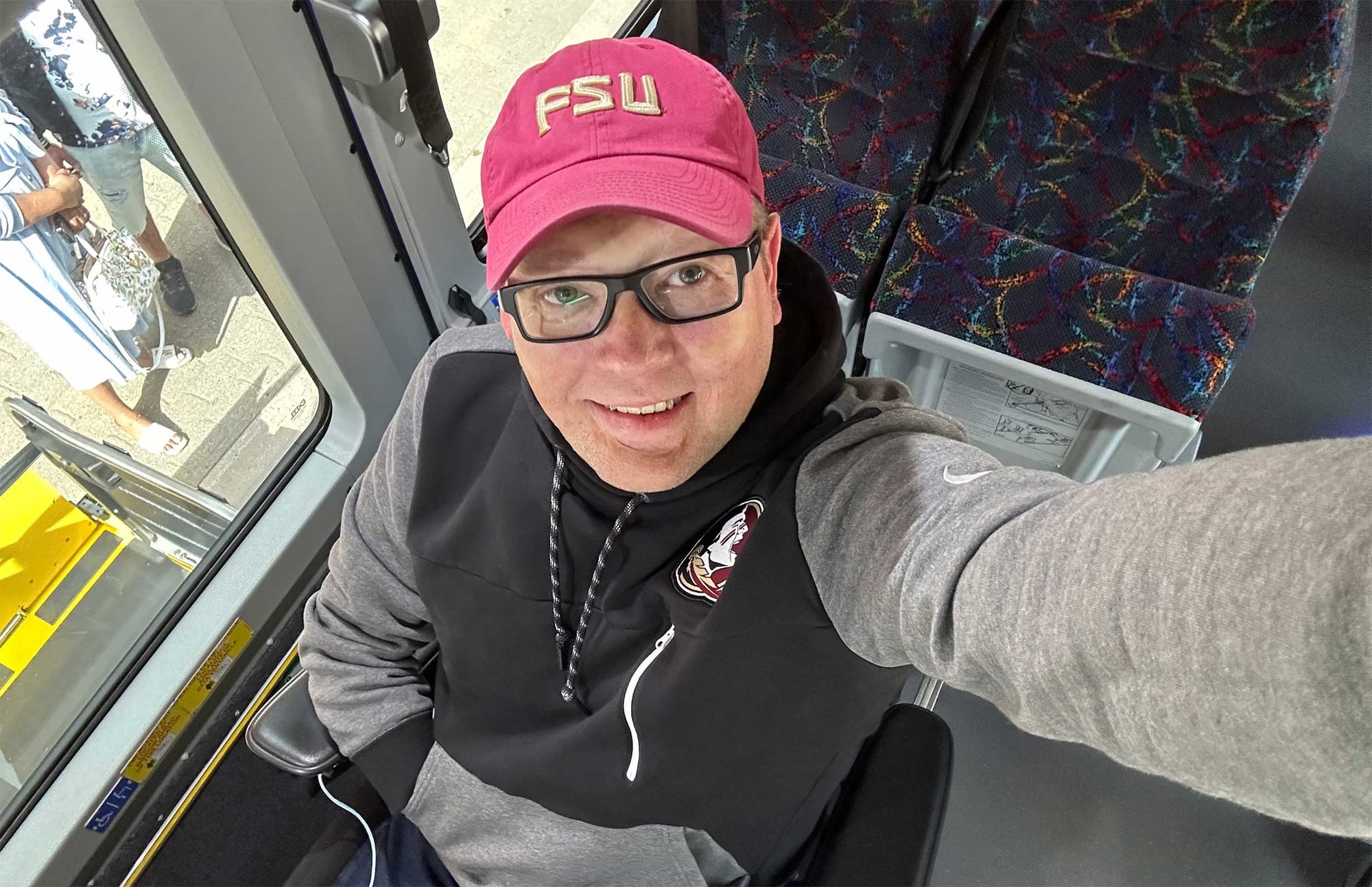 We soon departed and, about 100 yards into our journey, the seats directly in front of me slid backwards — I reacted quickly and saved my knees from being crushed. The seat hadn’t been locked into place, and it is to that row of seats that the wheelchair securement mechanism attaches. I learned a lesson — always ask bus drivers to check and double check that the seats are secured… and supervise that testing! After the seats were properly secured (I heard a loud “click” as the lock fell into place), we set off again and the remainder of the ride proved uneventful, just as it should be!