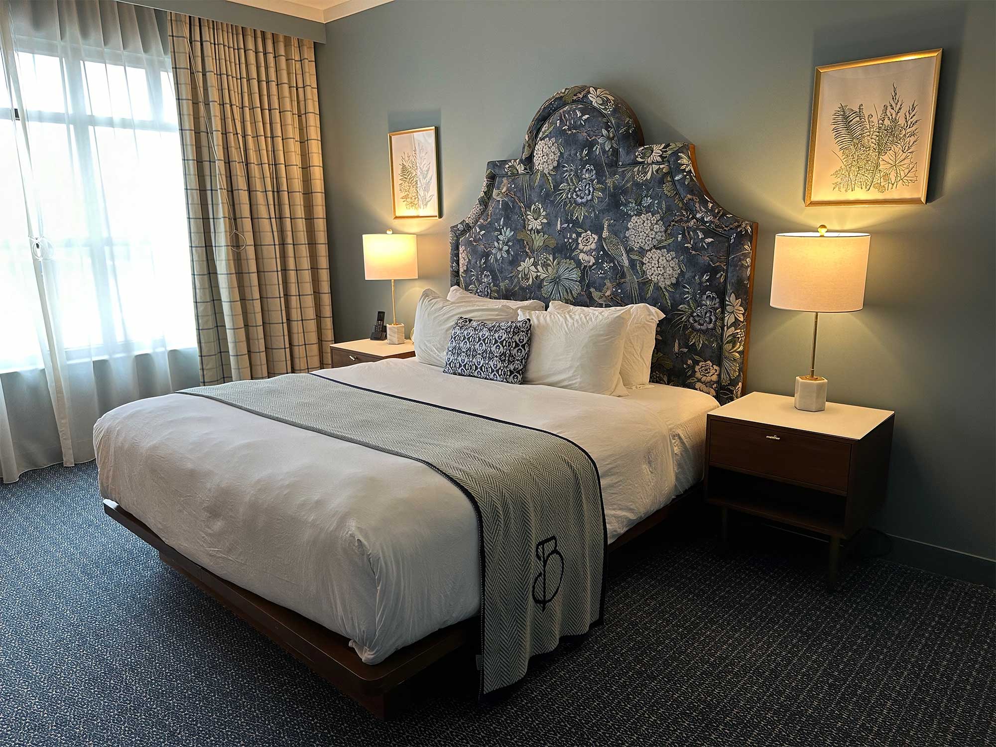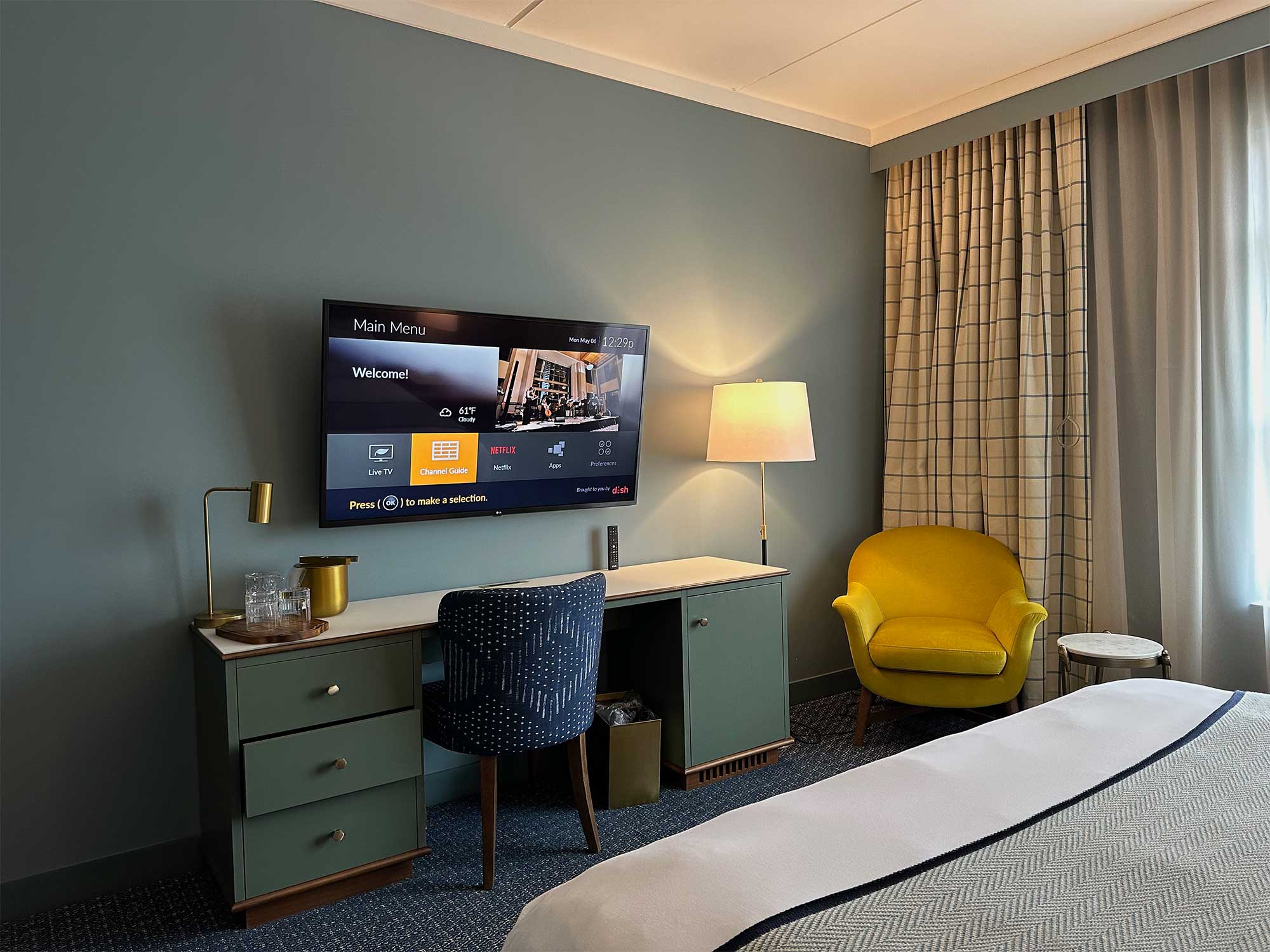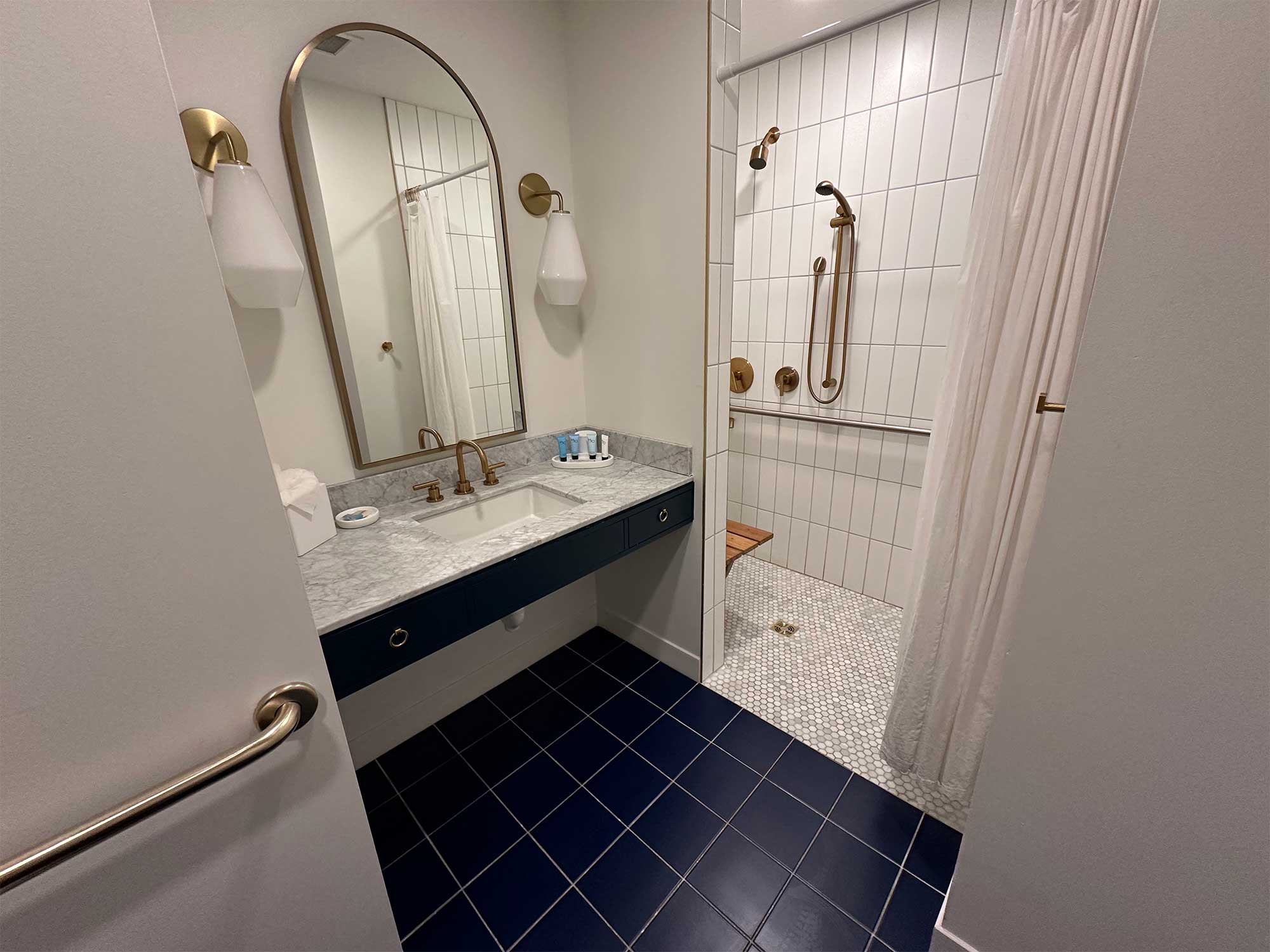 The Bradley Hotel offers ADA accessible guest rooms with both one and two beds and a roll-in shower. The king size bed in my room measured 25 inches in height from the floor to the top of the mattress, with the mattress sitting atop an 11 inch platform base. A desk in the room measured 30 inches tall, with 28 inches of clearance underneath.