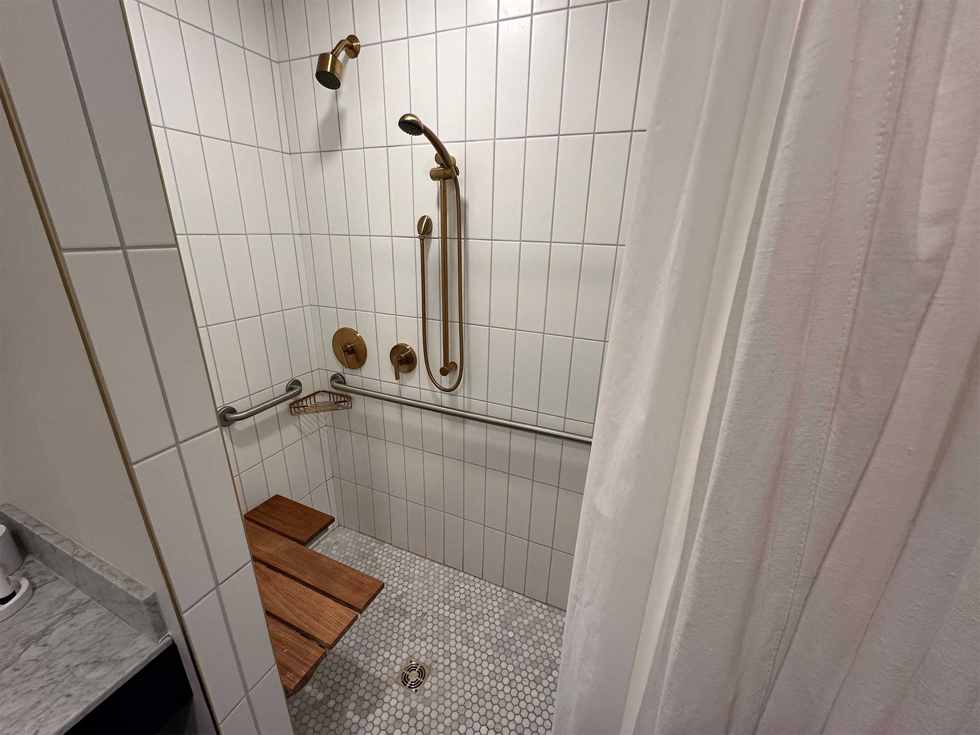 The bathroom featured a roll-under sink, toilet with grab bars, and a roll-in shower with a portable shower chair. There was plenty of space to maneuver my large power wheelchair, and a spot to park the wheelchair directly alongside the toilet for safe lateral transfers.