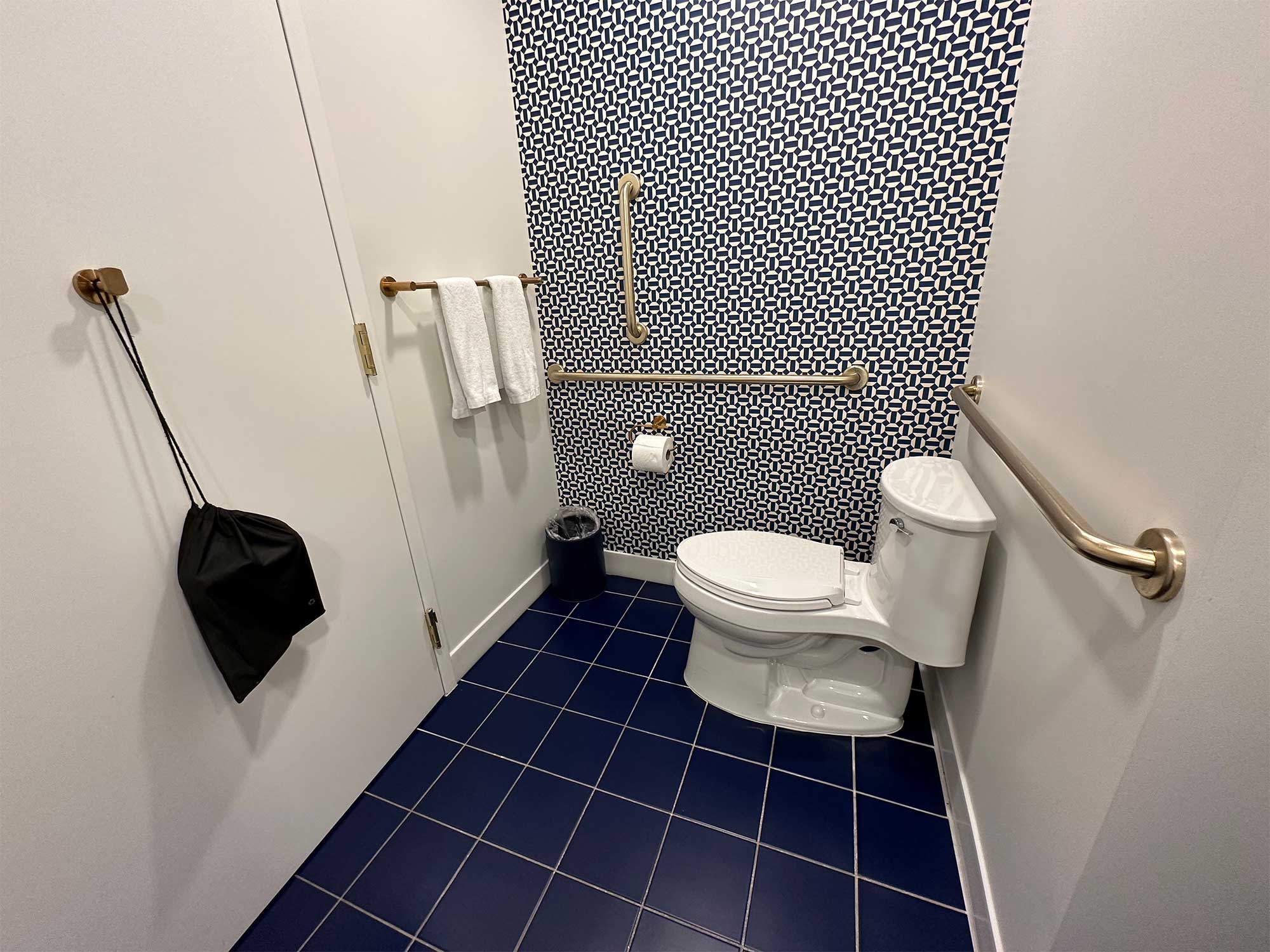 The wheelchair accessible bathroom is one of the most accessible in the City of Fort Wayne. The room I toured featured a roll-under sink, toilet with grab bars, and a roll-in shower with a wall-mounted seat and water controls within reach.