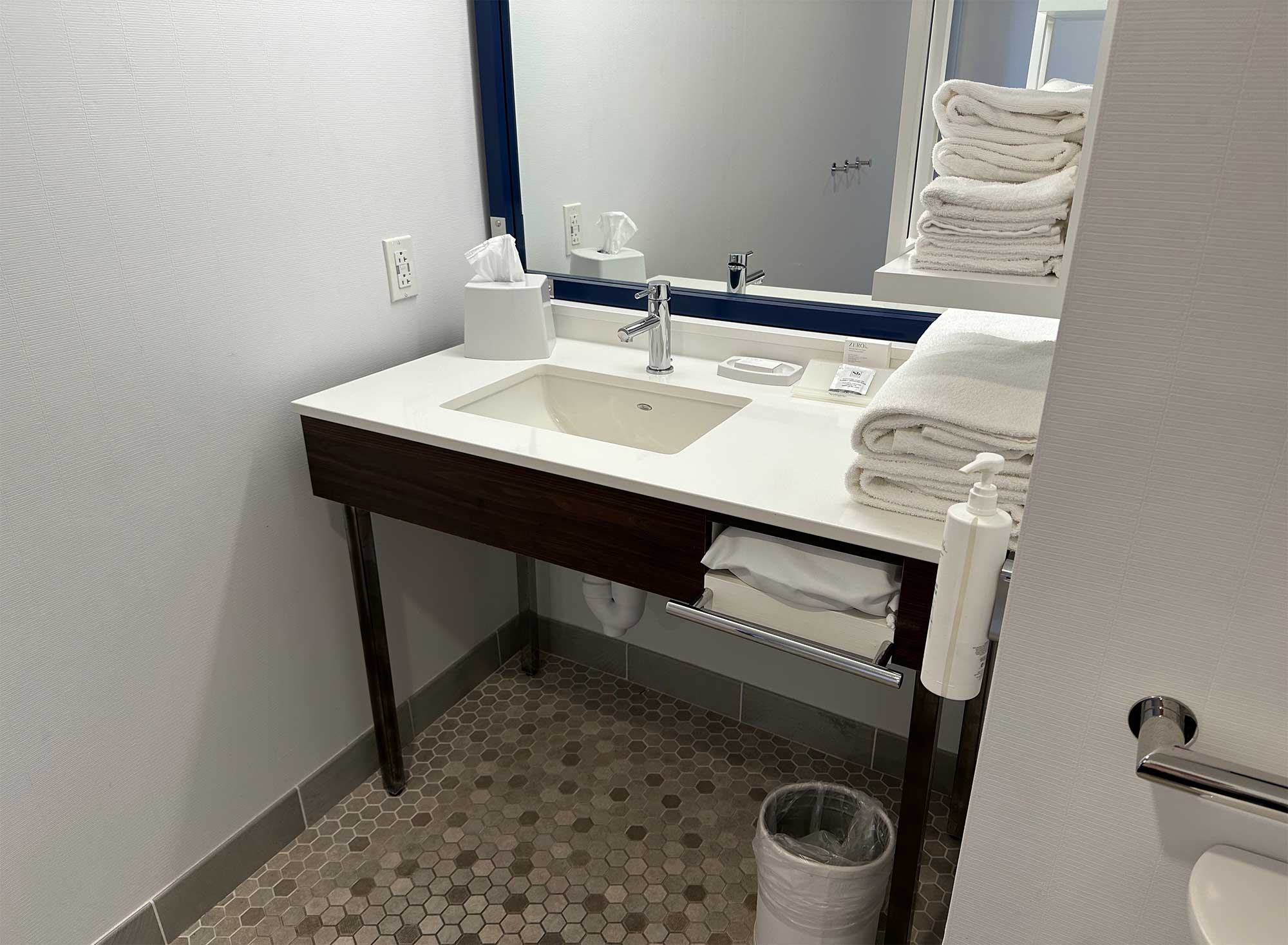 The Hampton Inn & Suites offers ten ADA accessible guest rooms with both one and two beds and a roll-in shower or bathtub. The accessible room inventory consists of one double queen room with a roll-in shower, one double queen room with a bathtub, seven rooms with a king size bed and tub, and one king suite with a roll-in shower. I toured the accessible suite with a roll-in shower.