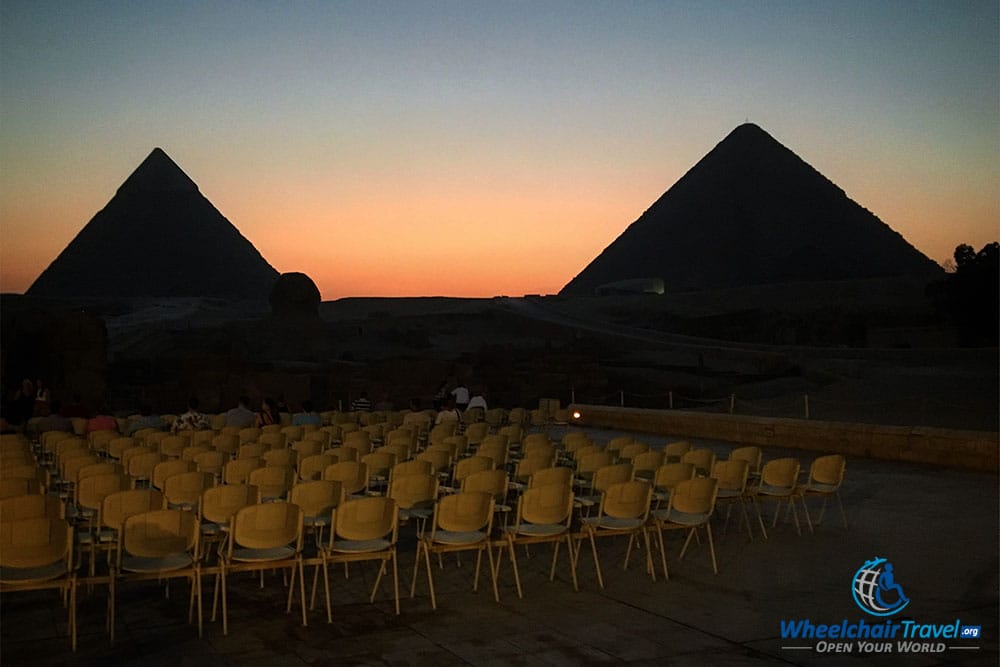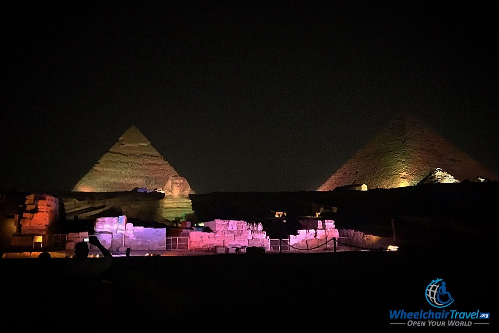 Wheelchair users are allowed to sit in the front row, and the seating area is wheelchair accessible courtesy of a ramp. You’ll be close to the Sphinx, and have a great view of the lights as pictured above. The audio is played loudly, but those who are hard of hearing may have difficulty.