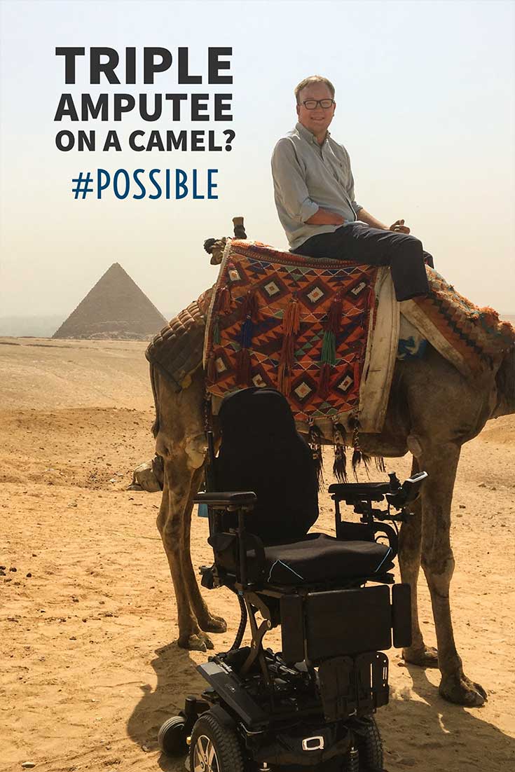 Less than a week before my trip, my new wheelchair arrived — the Quantum Q6 Edge 2.0 with iLevel technology. iLevel allows me to raise the seat of the wheelchair an entire 12 inches, which made transferring onto the camel’s back easier and much safer. Thankfully, you can “board” a camel while it is laying down, so you won’t have to climb aboard when he (or she) is standing at his/her fully-grown height of about seven feet.