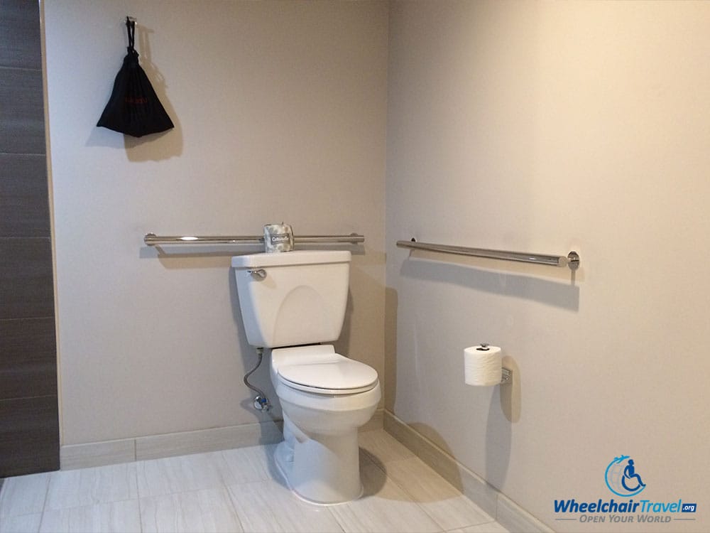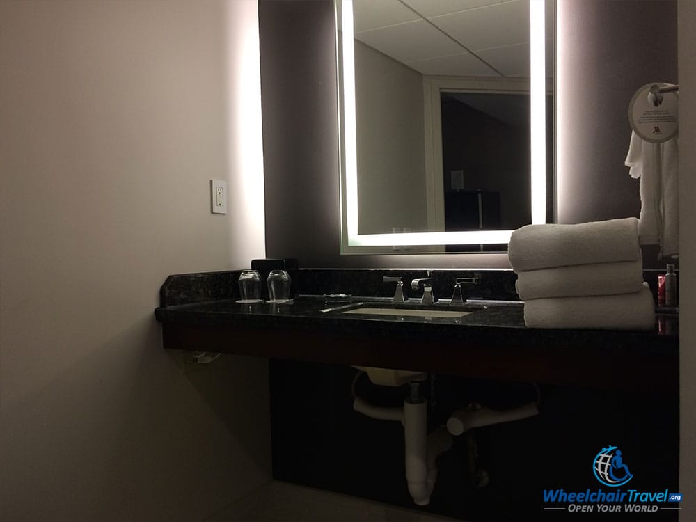 The bathroom was large and nicely accessible. The sink was safe to roll my wheelchair underneath, and I did’t having to worry about bumping my knees. The bath towels were folded and set on the sink’s countertop, and the hand towels were hung on a rack next to the sink. Everything was within reach.
