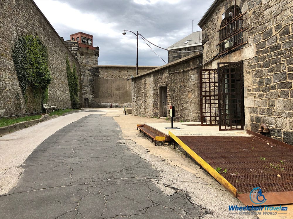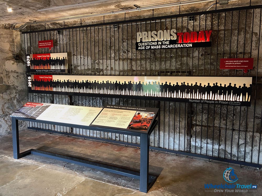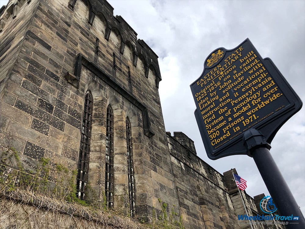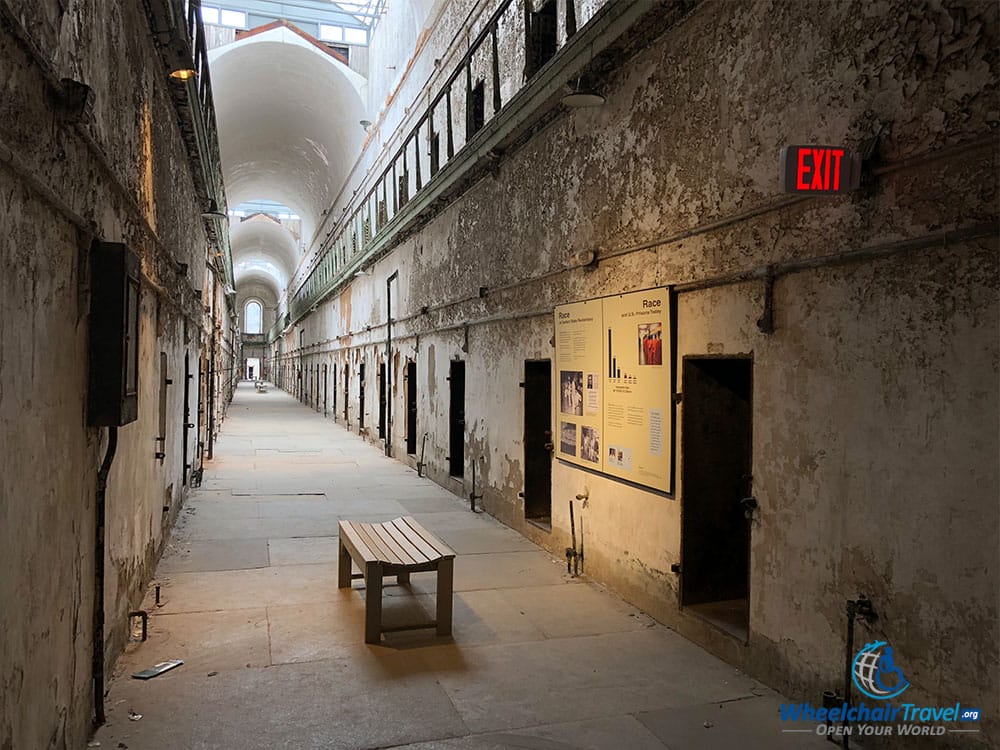 The museum tour is mostly wheelchair accessible, with barrier-free entry to the first floor of every cell block. However, wheelchair users will be unable to access the upper floors of cell blocks. Entry into individual cells is also not possible, except for able-bodied persons who can step over thresholds of up to one foot. The bathrooms at the facility are also not accessible, and I only found a porta-potty that could accommodate a wheelchair. Although Eastern State is a U.S. National Historic Landmark, additional work should be done to increase accessibility.