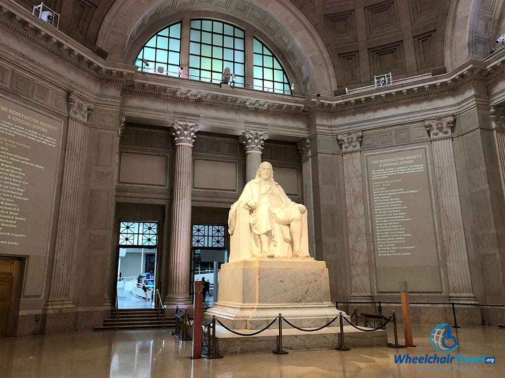 Behind the museum admissions desk, visitors will find a great hall containing a 20-foot high statue of Benjamin Franklin, created by sculptor James Earle Fraser. The hall, and the towering statue of Franklin, constitute what congress designated in 1972 as the Benjamin Franklin National Memorial.