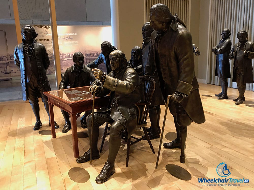 Visitors should begin their tour with Freedom Rising, a theatrical production that takes place in the multi-level circular Sidney Kimmel Theater. Following the performance, which lasts approximately 17 minutes, visitors will be directed into “The Story of We the People,” an expensive exhibit containing historical information and artifacts, interactive components and an interesting mock polling booth that sheds light on the political positions of past presidents. The final permanent exhibit, Signers’ Hall, contains full-size statues of the delegates to the Constitutional Convention. Pictured above are the statues of the Pennsylvania delegation, which included Benjamin Franklin.