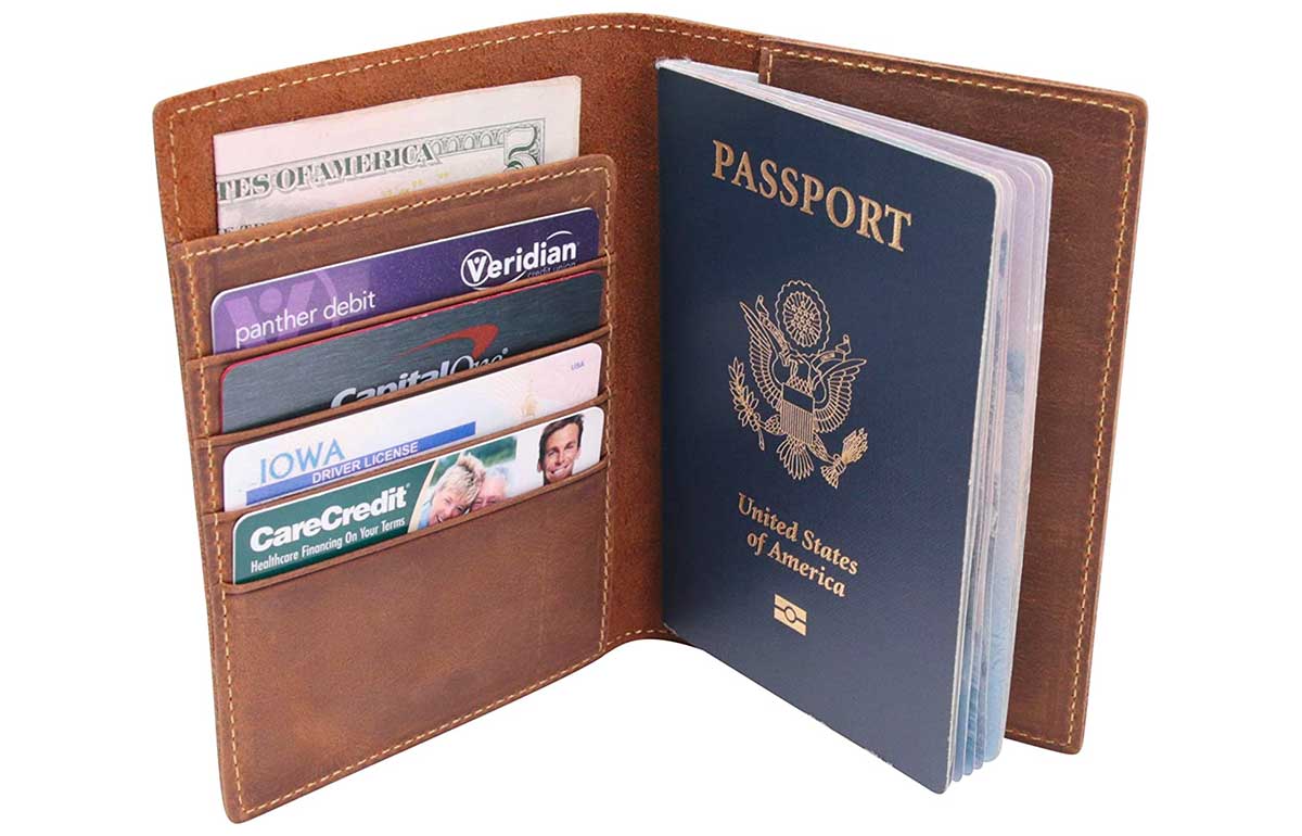 Protect your passport from damage with this stylish brown leather passport holder that includes slots for credit cards, ID cards, and cash — you’ll be much less likely to lose these critically important items when you store them together.