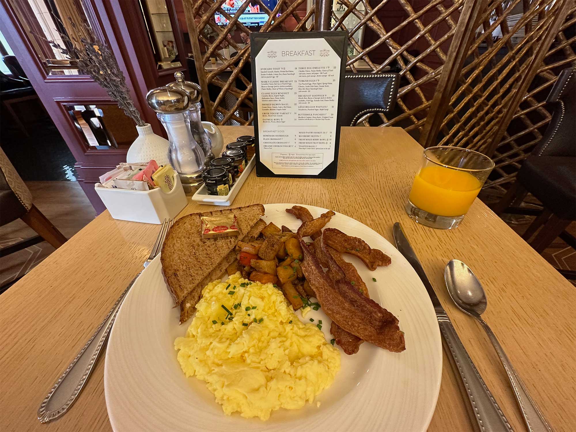 The InterContinental Mark Hopkins hotel has one restaurant on site — the Nob Hill Club, which serves breakfast, lunch and dinner. I enjoyed a classic American breakfast in the restaurant to use the $10 credit included with the destination fee.