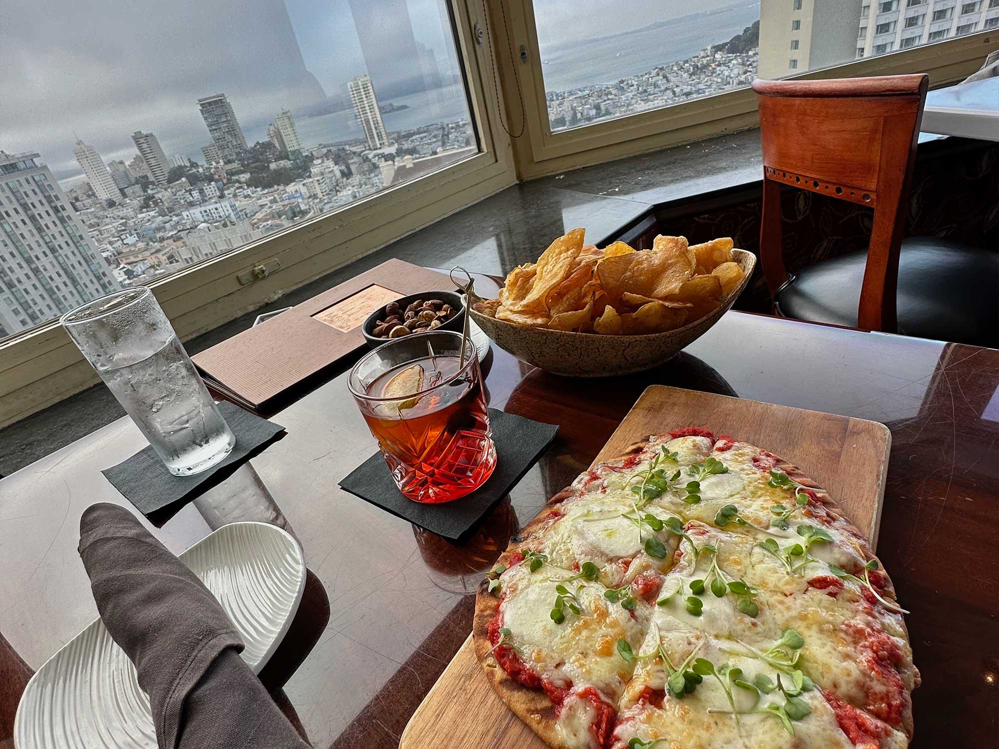 I also visited the Top of the Mark bar on the hotel’s top floor, which offers incredible views of the city and San Francisco Bay. In addition to a full cocktail menu, there are a number of appetizers and light bites available. I enjoyed the Margherita flatbread pizza.