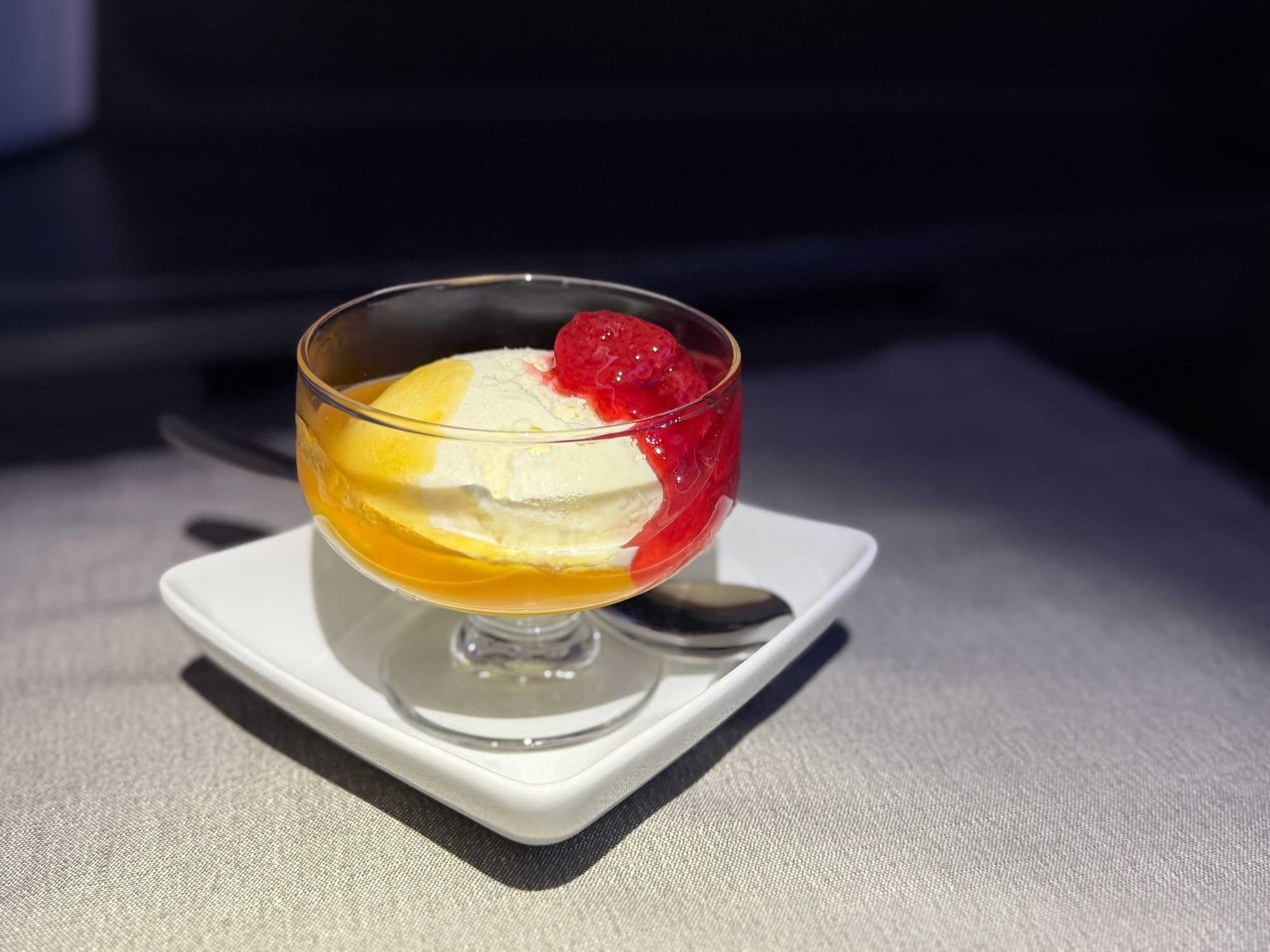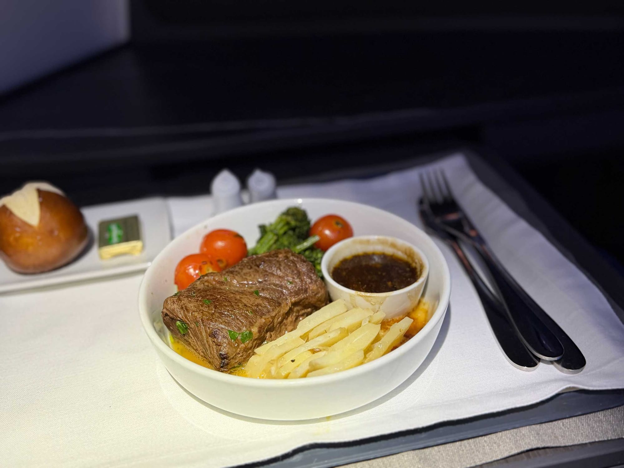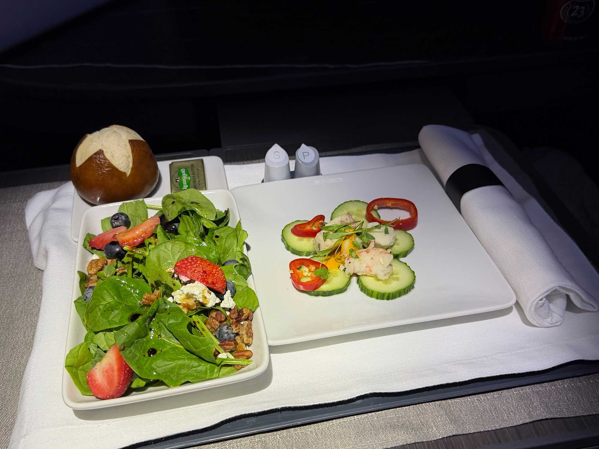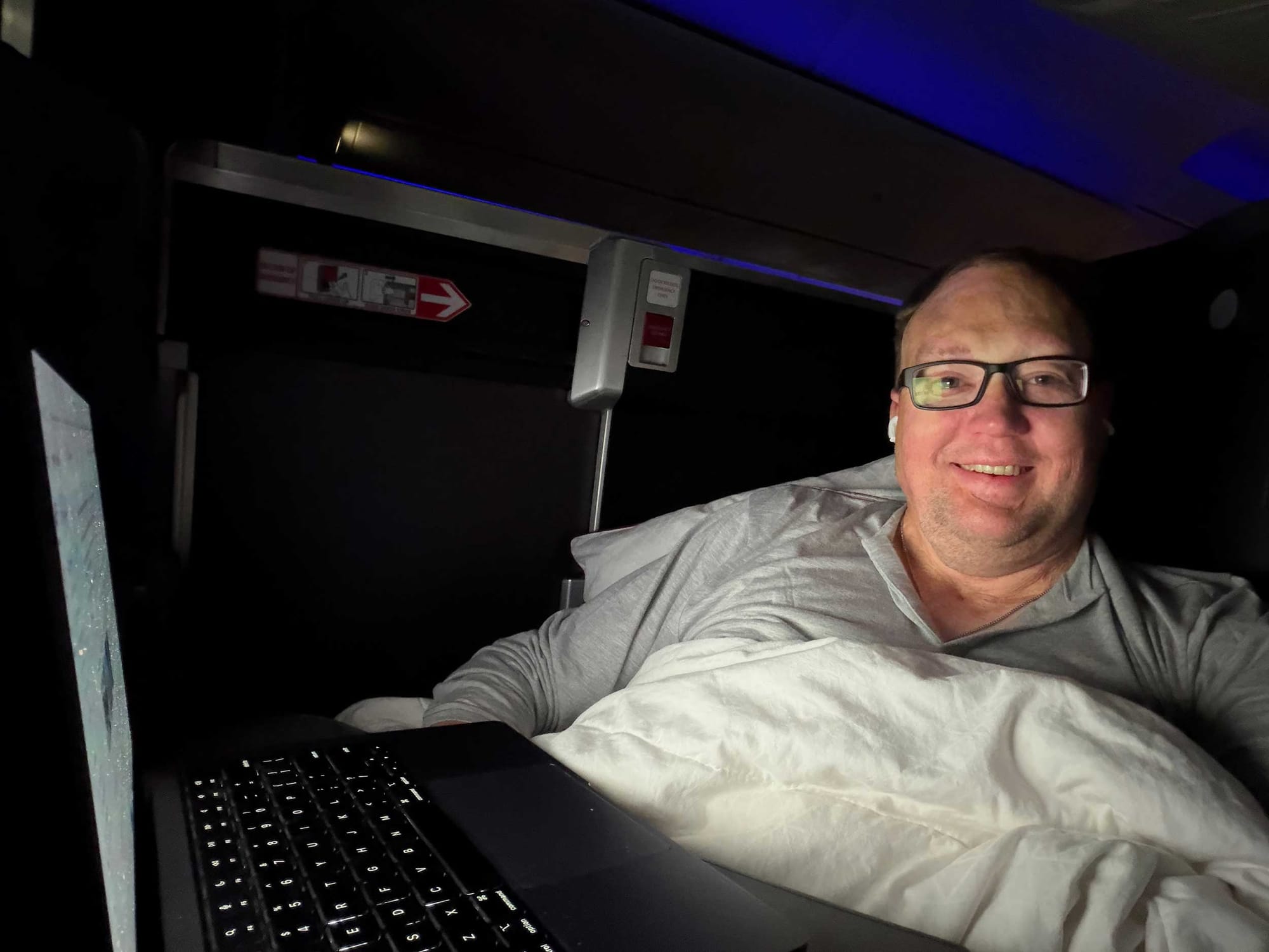 During the flight, I focused primarily on working from my laptop (the Viasat Ka-band satellite wifi is fast and free), but I also got about six to seven hours of sleep.