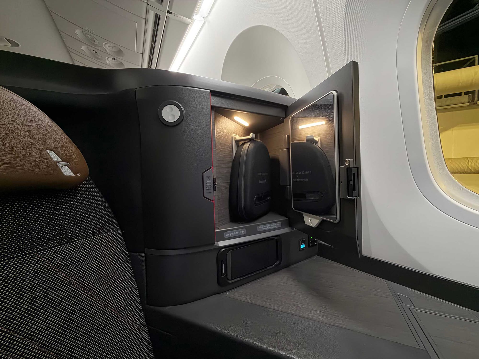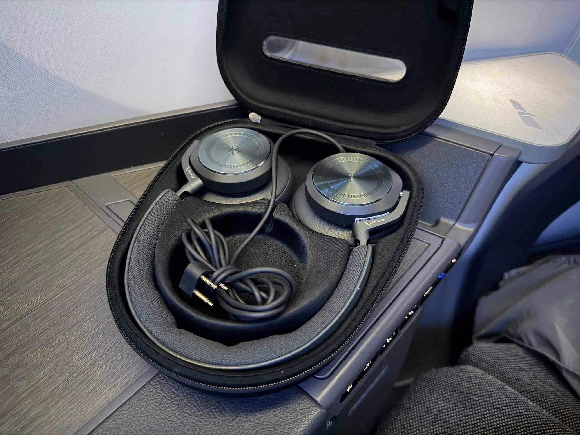 Noise-canceling headphones are stored in a cubby next to the seat, though they are of low-quality. One exciting new feature is the ability to pair your own wireless headphones with the inflight entertainment system.