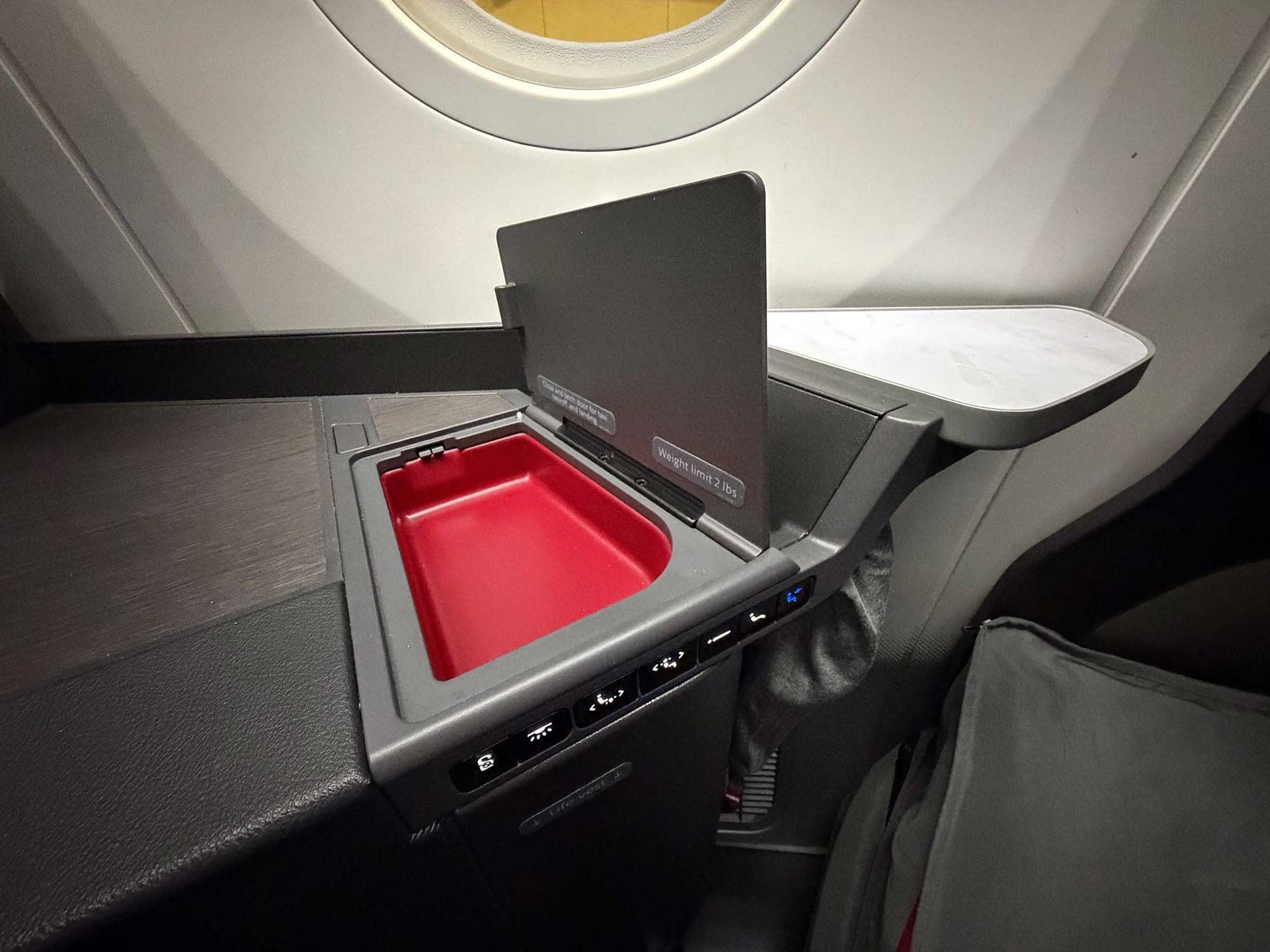A console to the left of the seat served as an armrest, while also containing a tiny storage compartment. A series of buttons gave me full control over seat positioning, with the ability to adjust the seat’s backrest, bottom cushion and leg rest. While I was awake, I was able to recline into a lounge position, then lay the seat fully flat for sleep.