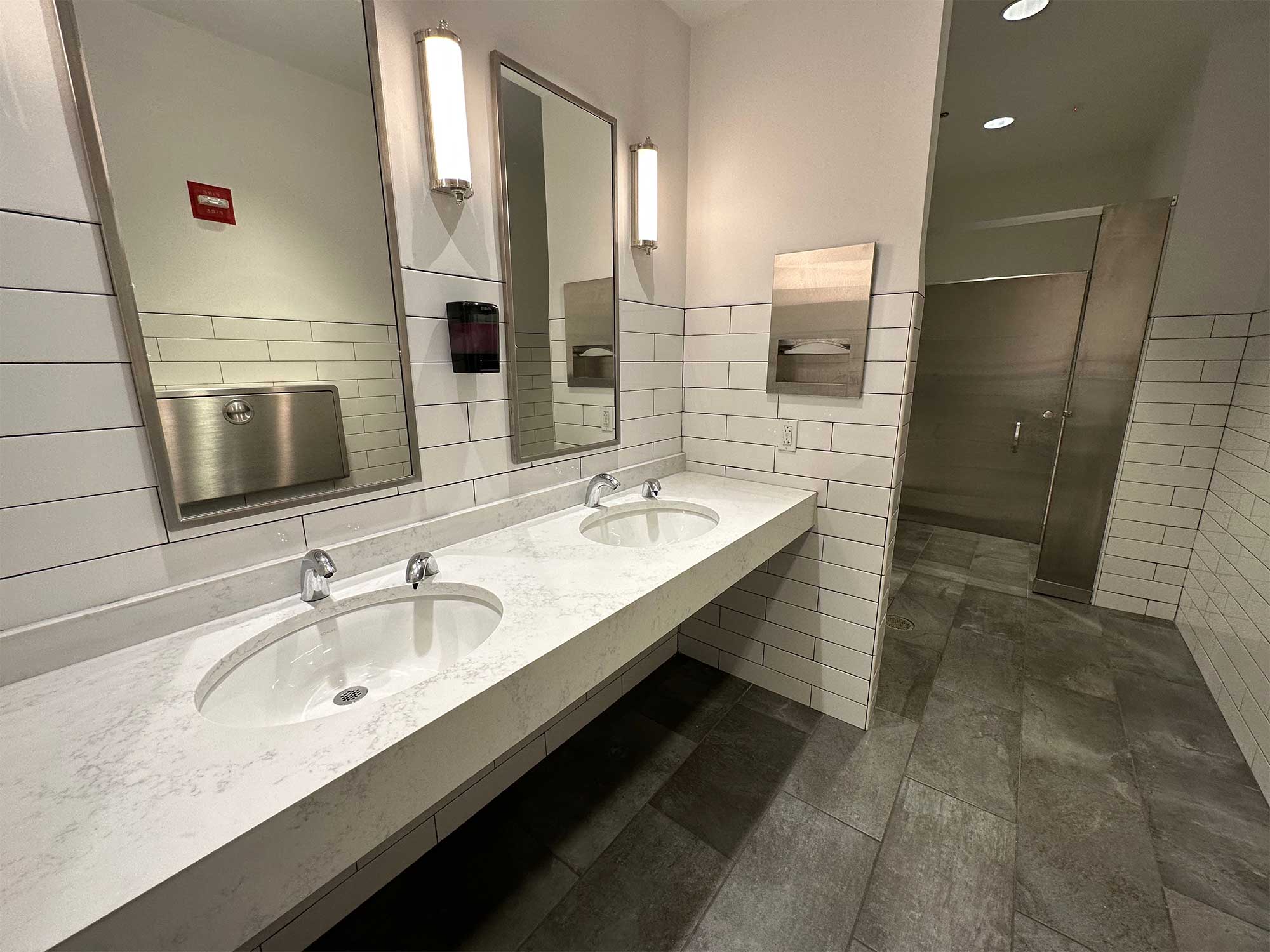 While much of the design is expected to remain the same (including the space-constrained wheelchair spaces), some dramatic improvements have been made in the bathroom, with a more thoughtful use of space and the inclusion of a touch-free door opening/locking system.