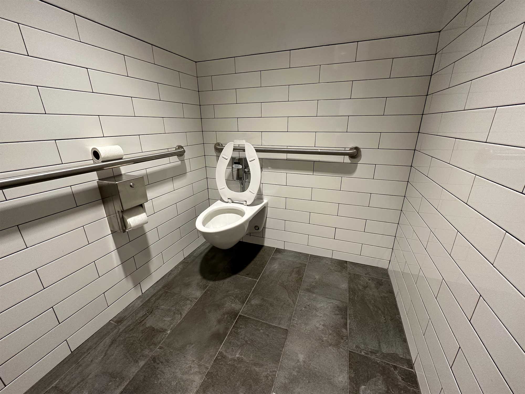 Most importantly, there is space to park a wheelchair directly alongside the toilet, allowing for safe lateral transfers. Grab bars encircle the entire space.