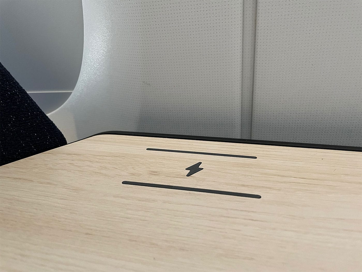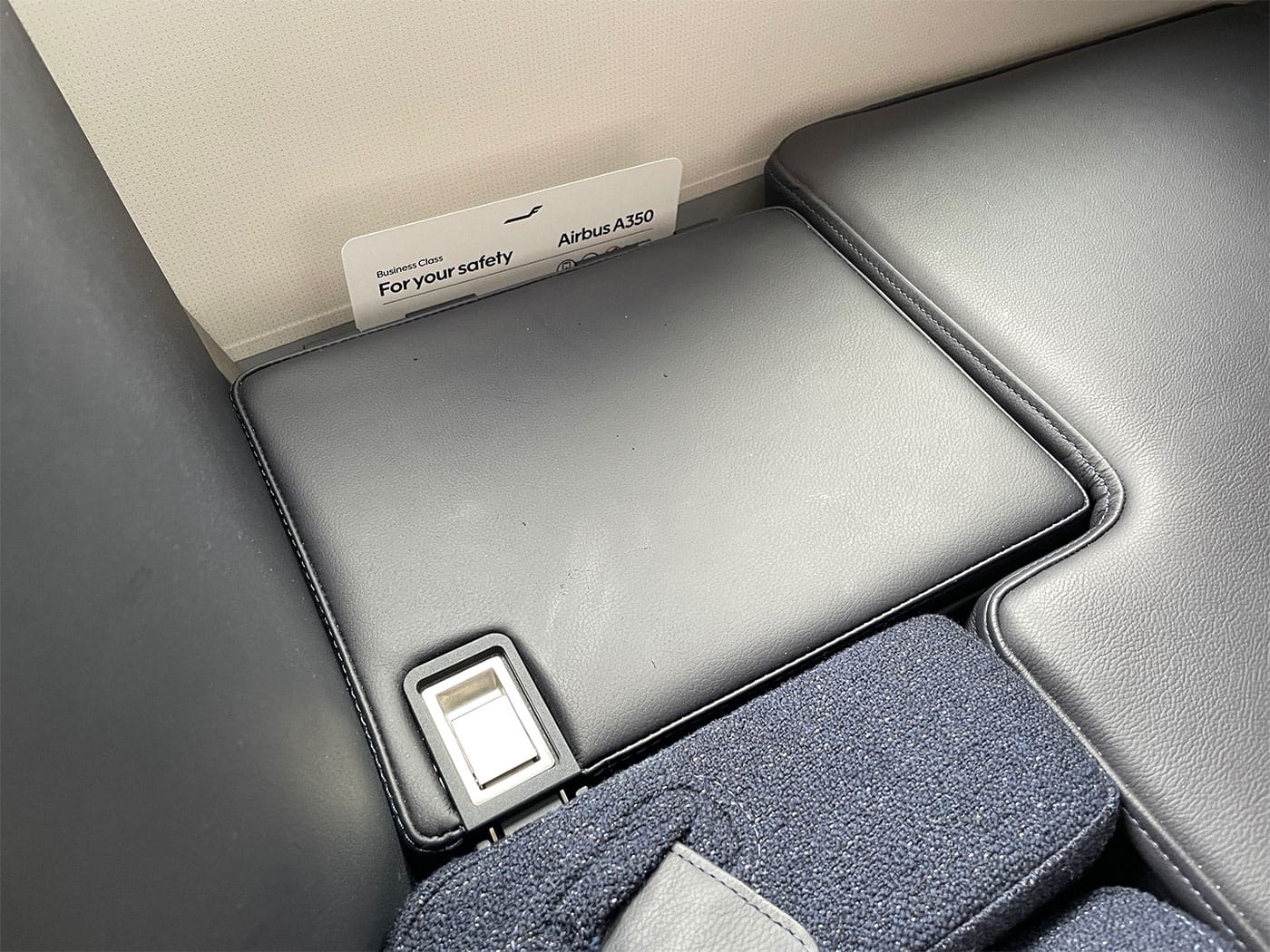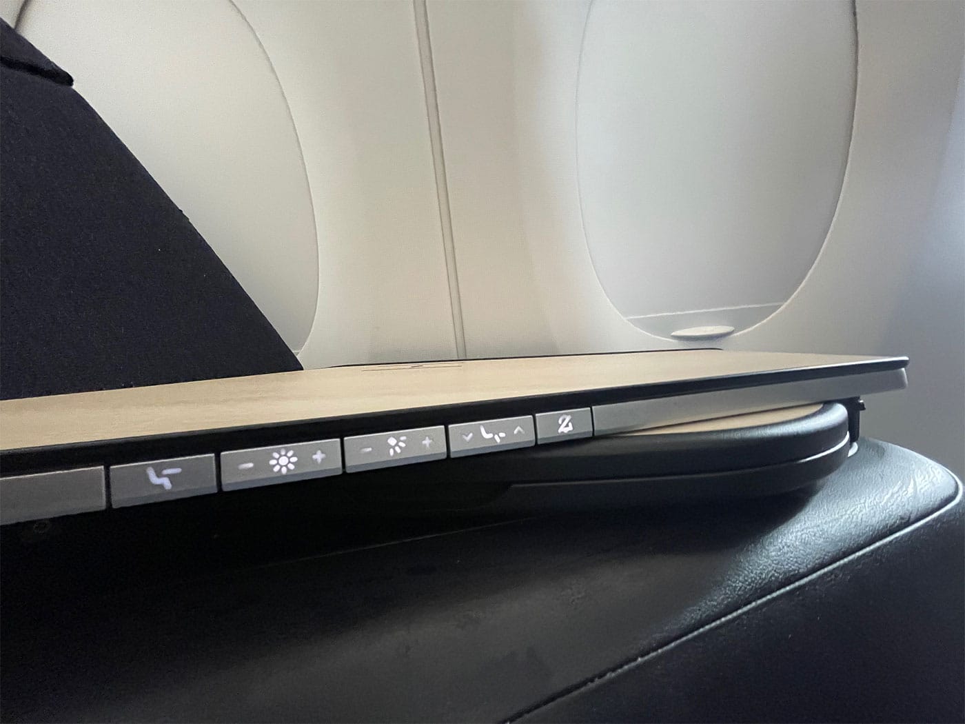 Overhead lighting can be controlled using buttons near the retractable tray table and nordic wood surface/armrest near the window (or center console if not in a window seat). A button to extend a portion of the seat for bed mode is located on this control panel as well. There is no recline feature, so that is the only power seat adjustment feature.