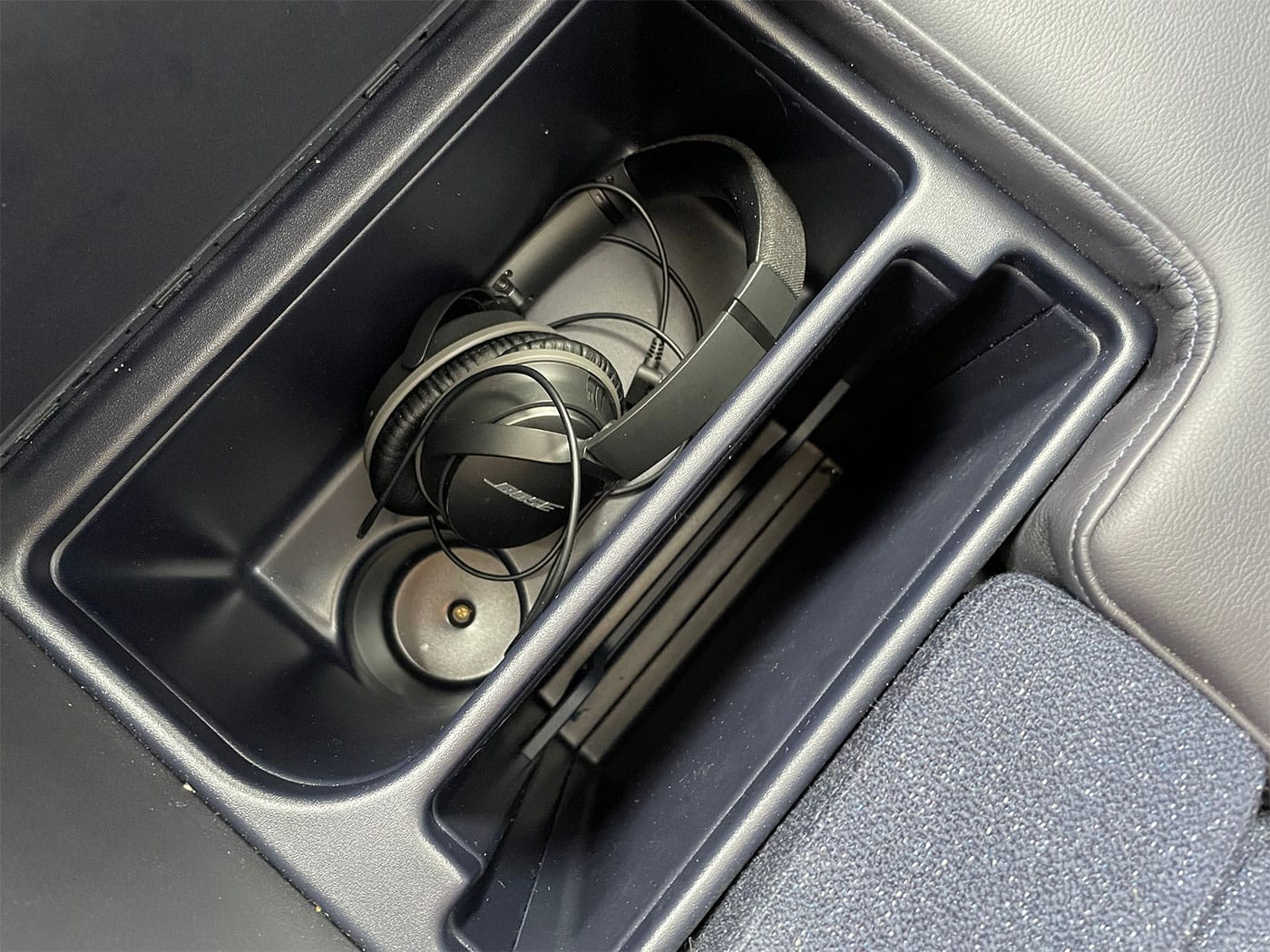 A Universal AC power socket, together with USB-A and USB-C charging ports are provided in a small headphone storage cabinet recessed within the seat back. A remote to control the entertainment features is also stored in this space.