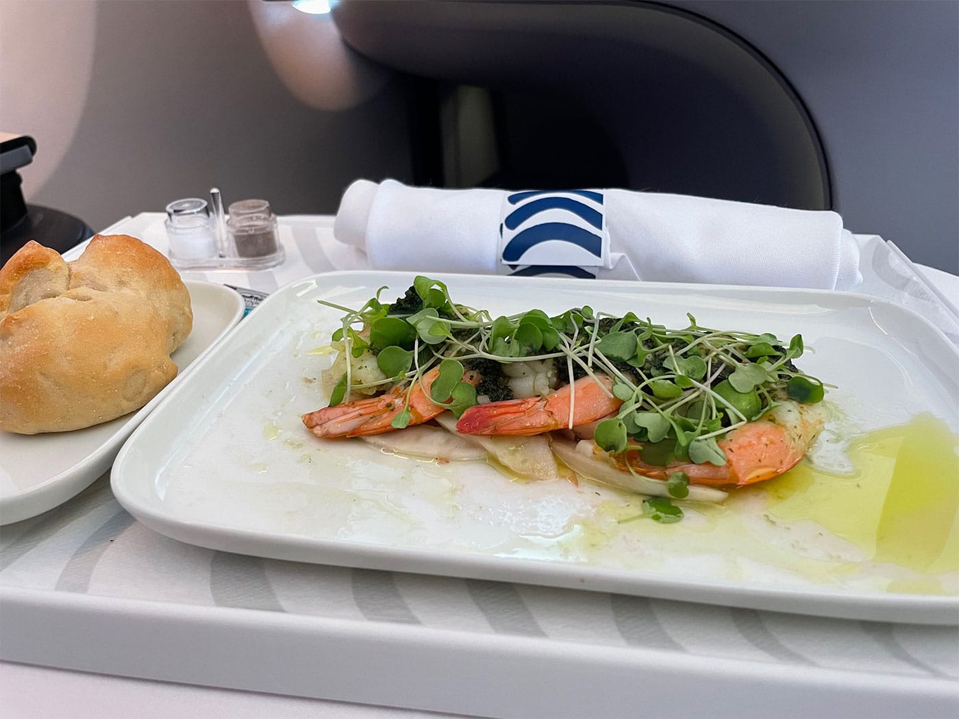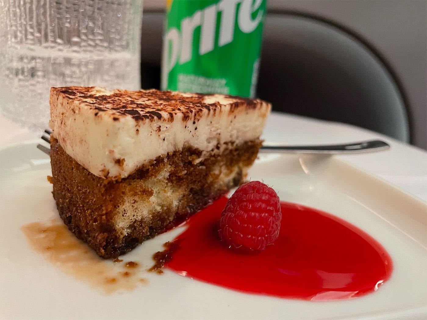 The meal’s starter had been a selection of prawns, and I concluded with a piece of delicious cake. Though the main course was forgettable, the meal service started and ended on a positive note!