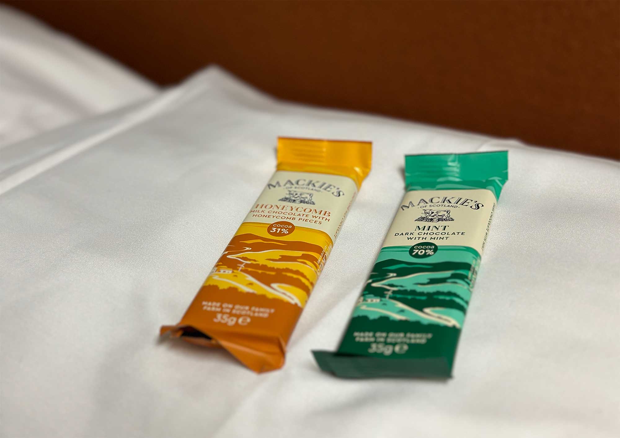 Upon entry to my cabin, I was greeted with two chocolate bars on the bed, as well as a sleep kit with eye shades and earplugs.