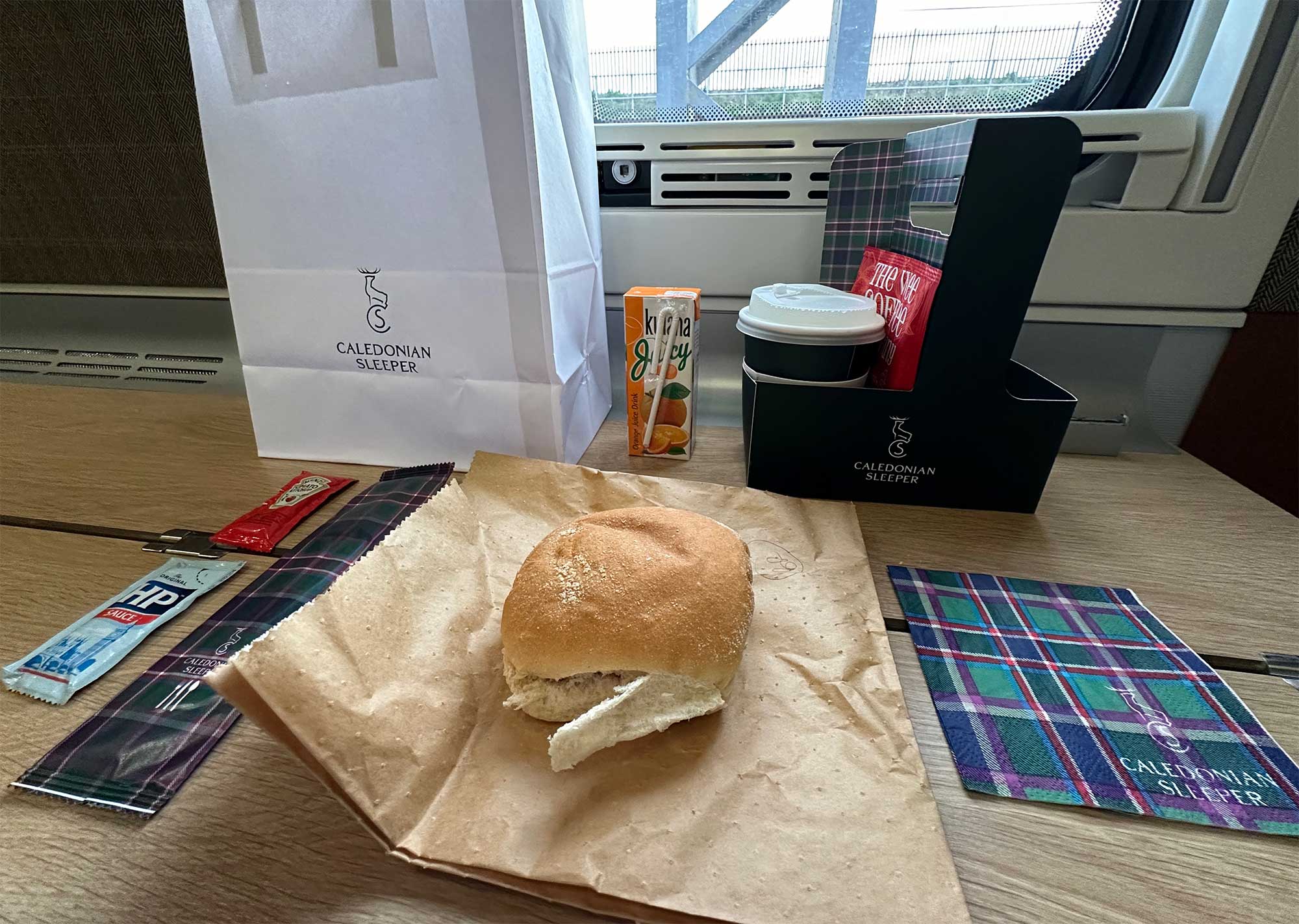 The options for breakfast delivered to the cabin included a Scottish Porridge Pot, Granola Yoghurt, Bacon or Sausage Roll, and a Vegan Roll. More substantial options were available in the dining car, including a traditional Scottish breakfast, a smoked fish frittata, and a traditional vegan breakfast. I opted for the sausage roll, with orange juice and coffee, but I soon regretted not visiting the dining car for the larger breakfast (it wasn’t very filling!).