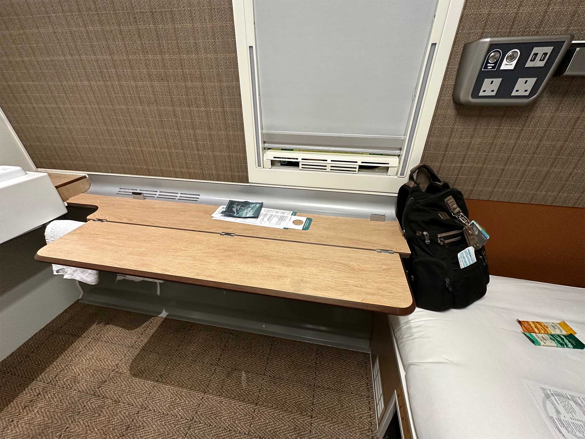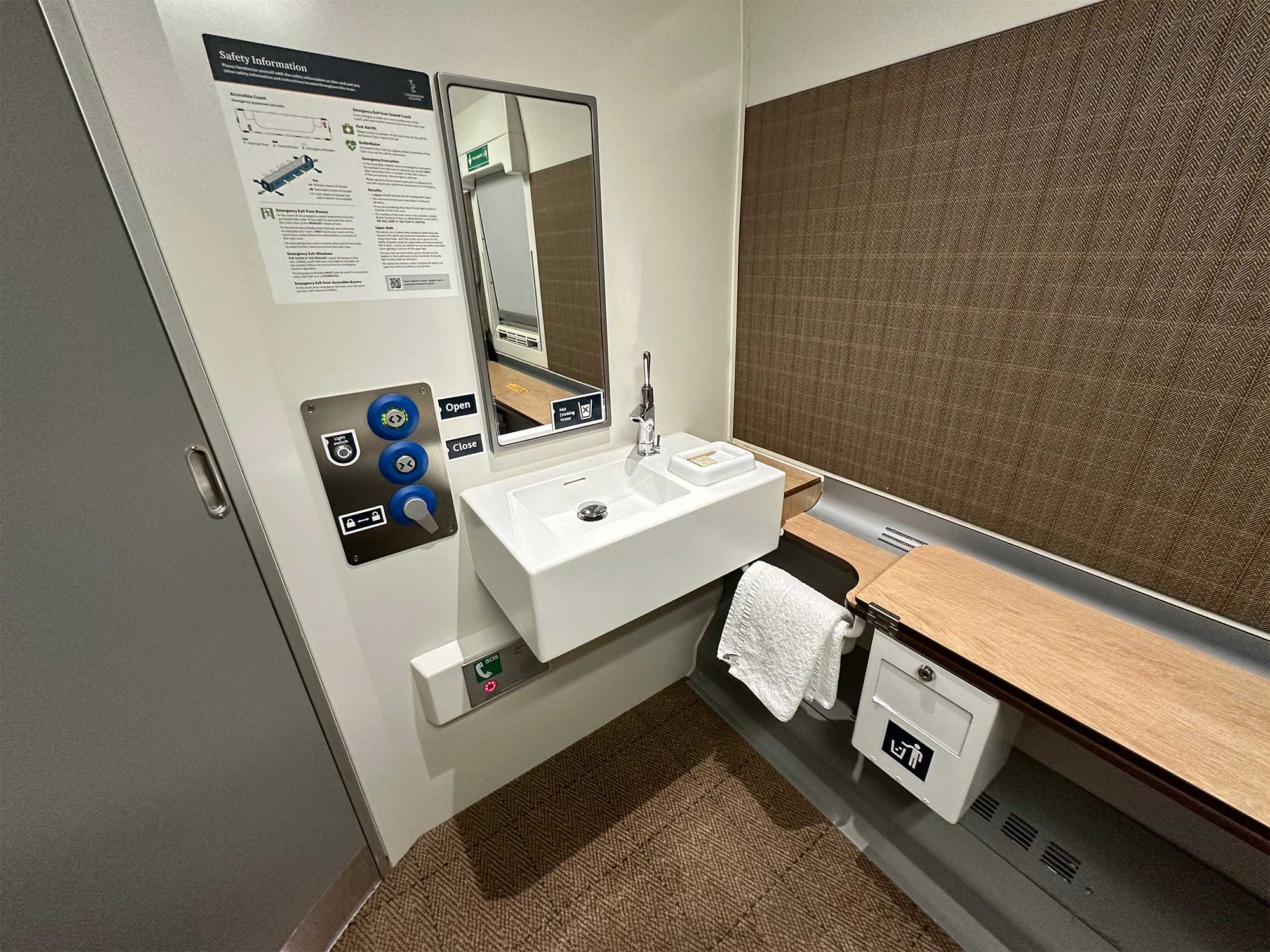 The accessible cabin features a wash basin and mirror, perfect for freshening up before bed, as well as a table for work or dining. The large window had a shade, which I drew down to prepare for a restful night’s sleep.