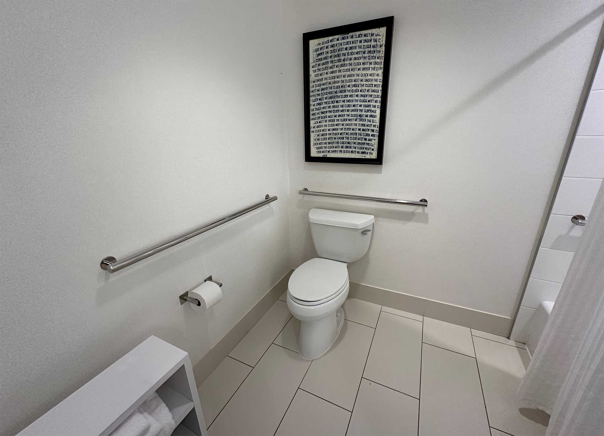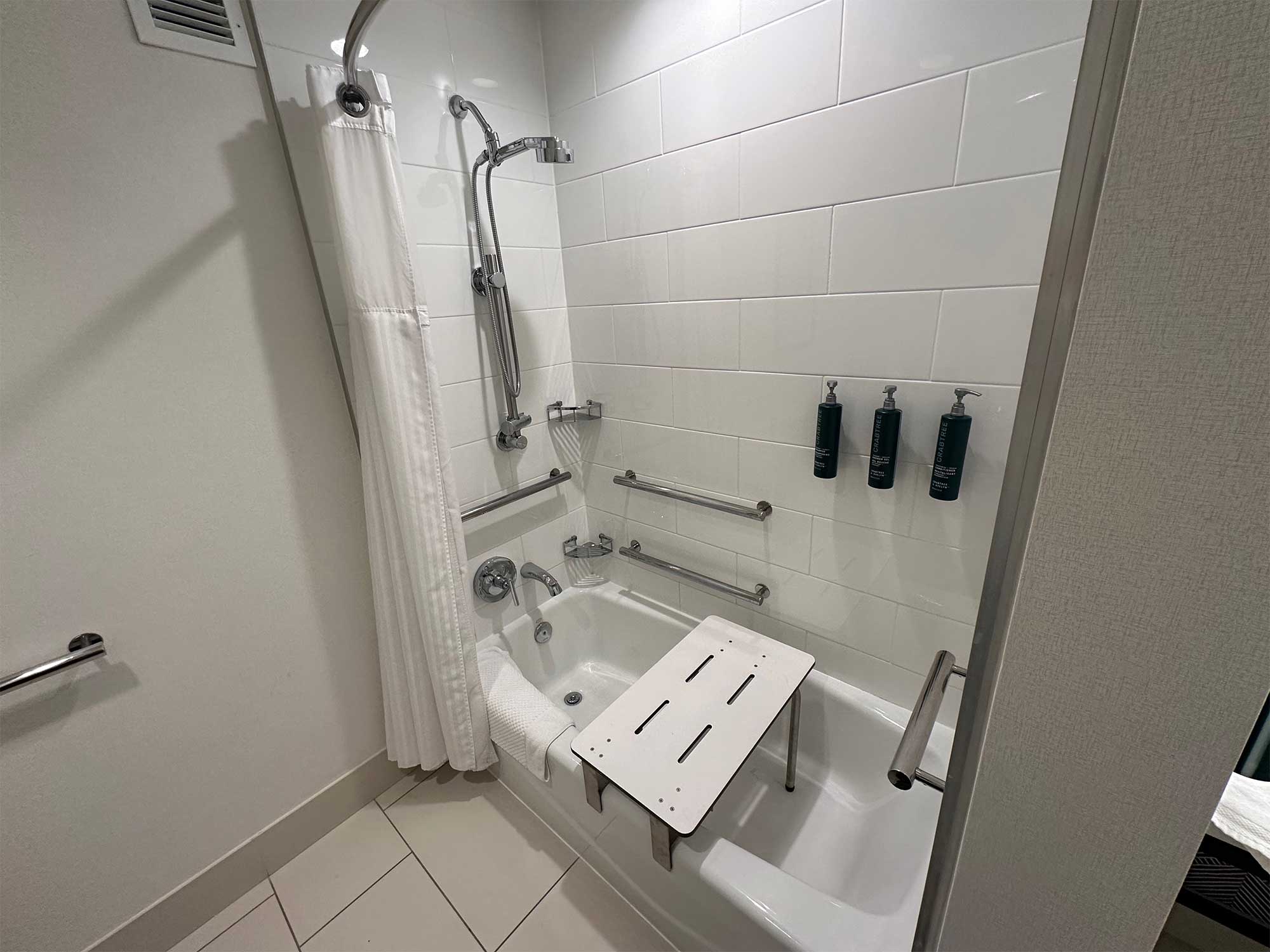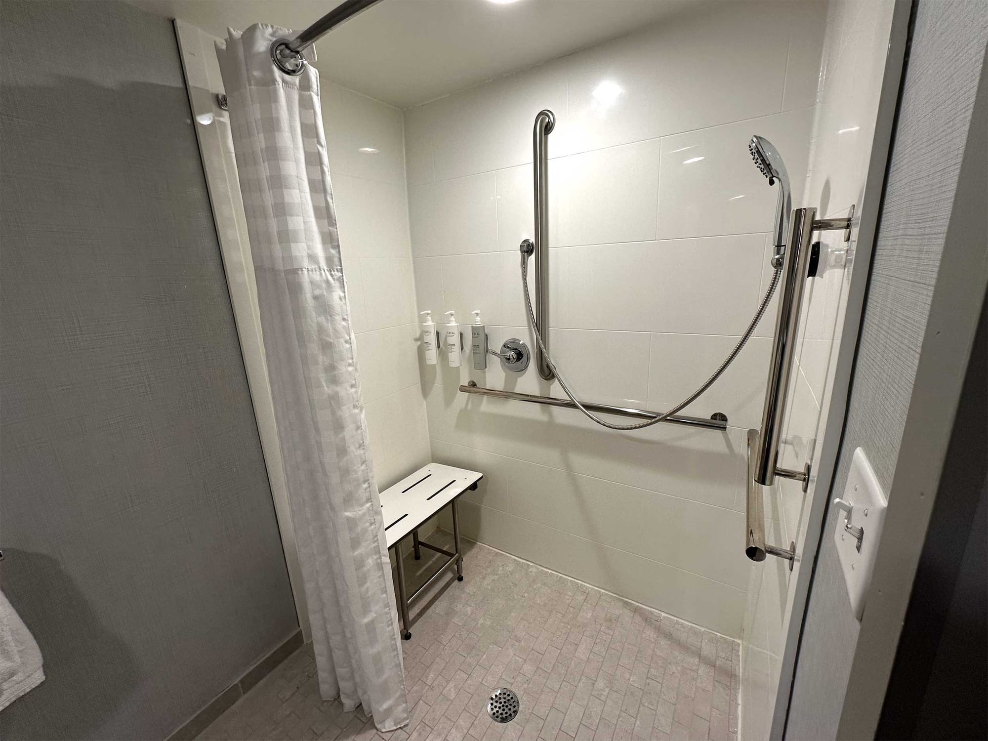 The room (#309) was spacious, featuring amenities like a sofa bed, desk, wet bar and mini fridge. The bathroom was accessible and the roll-in shower was outfitted with a folding wall-mounted seat. There was space to park my power wheelchair alongside the toilet, with grab bars on the adjacent walls. Here are some measurements of the bathroom’s accessible features: