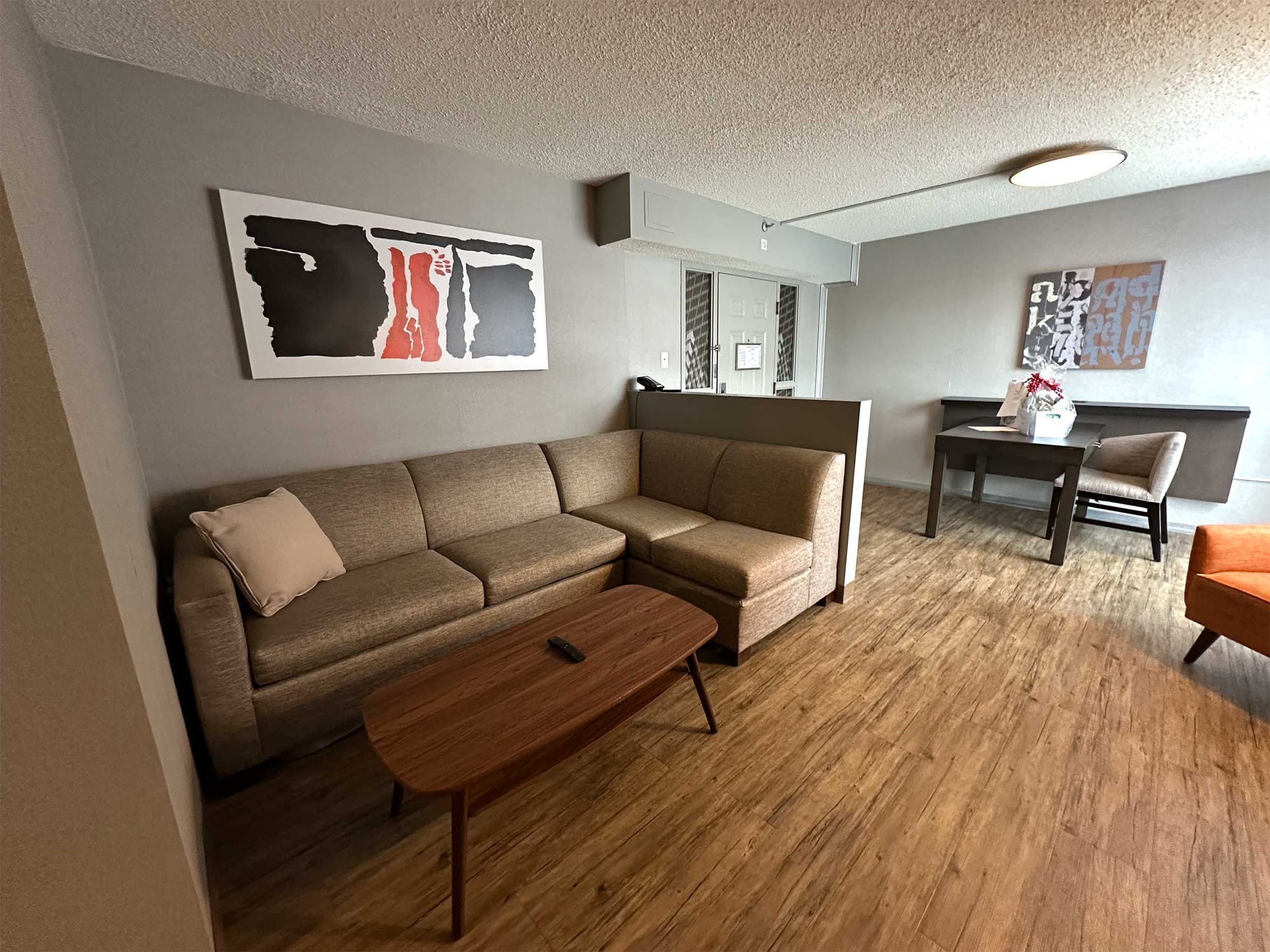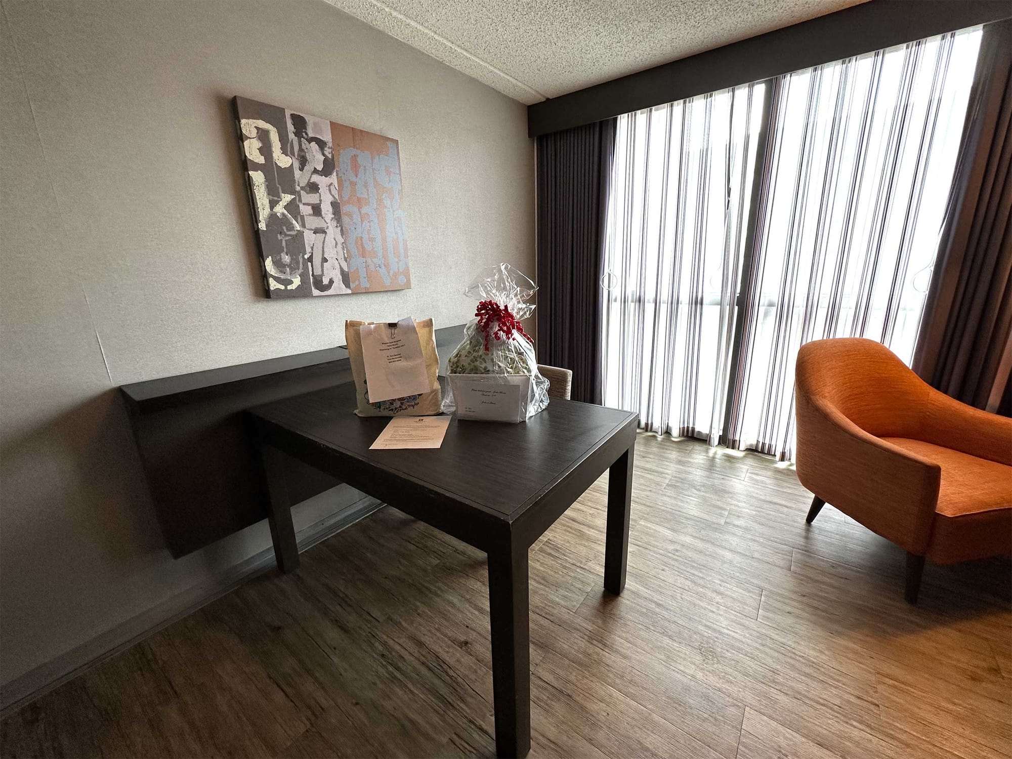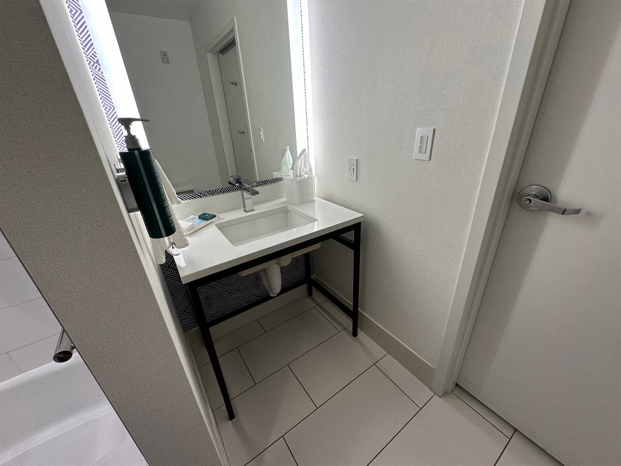 The room (#309) was spacious, featuring amenities like a sofa bed, desk, wet bar and mini fridge. The bathroom was accessible and the roll-in shower was outfitted with a folding wall-mounted seat. There was space to park my power wheelchair alongside the toilet, with grab bars on the adjacent walls. Here are some measurements of the bathroom’s accessible features: