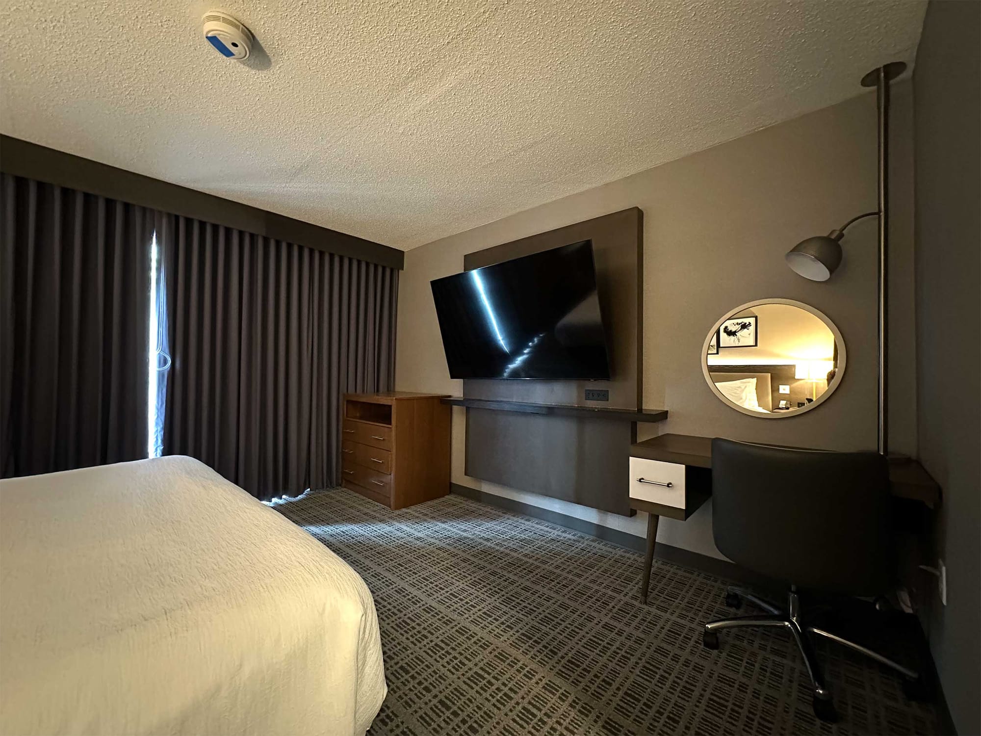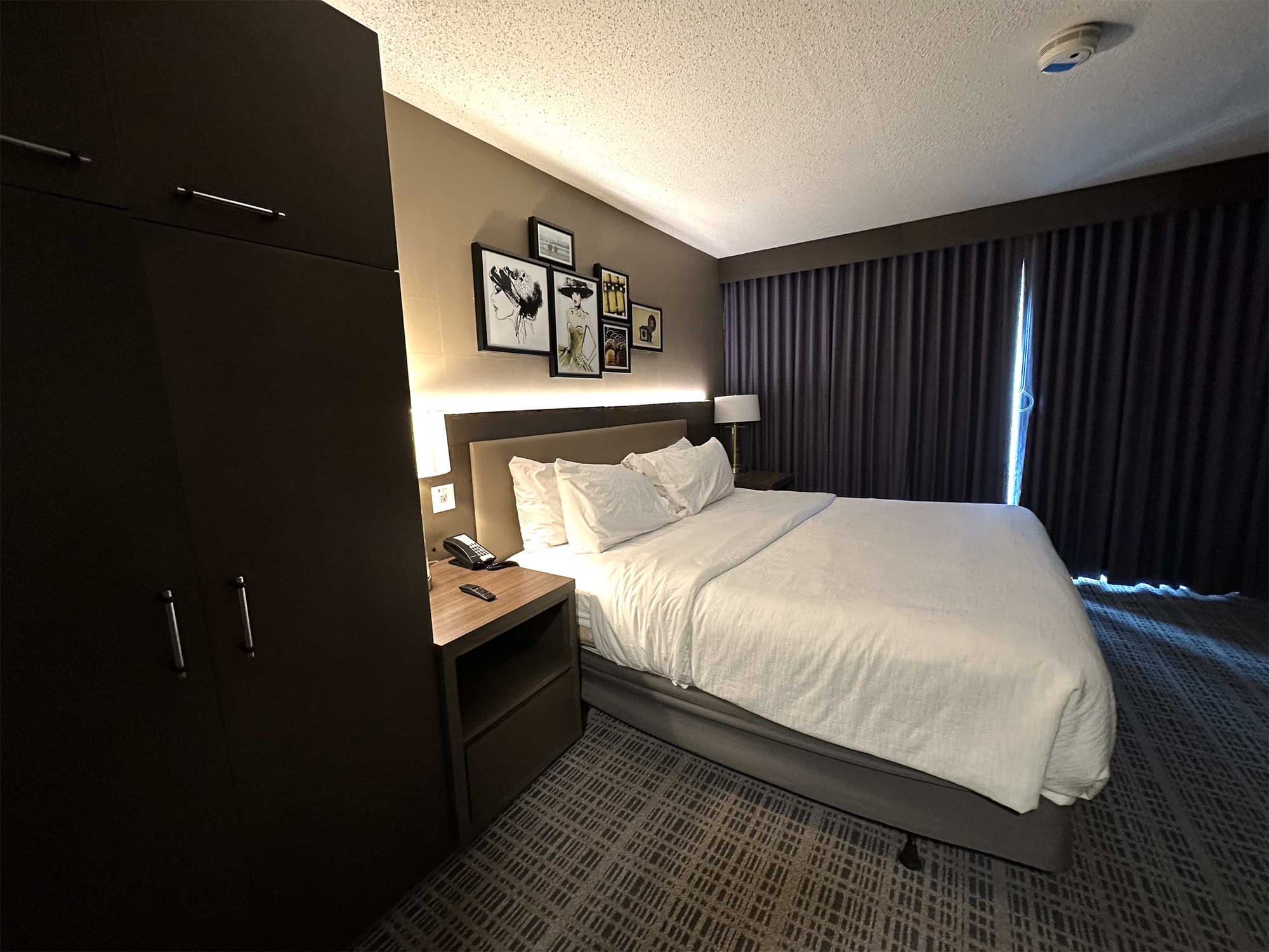 The hotel offers ADA accessible guest rooms and suites with both one and two beds and either a roll-in shower or accessible bathtub. I booked the 1 King Corner Suite with Roll-in Shower, and the king size bed measured 25 inches in height from the floor to the top of the mattress, with 7 inches of clearance underneath.
