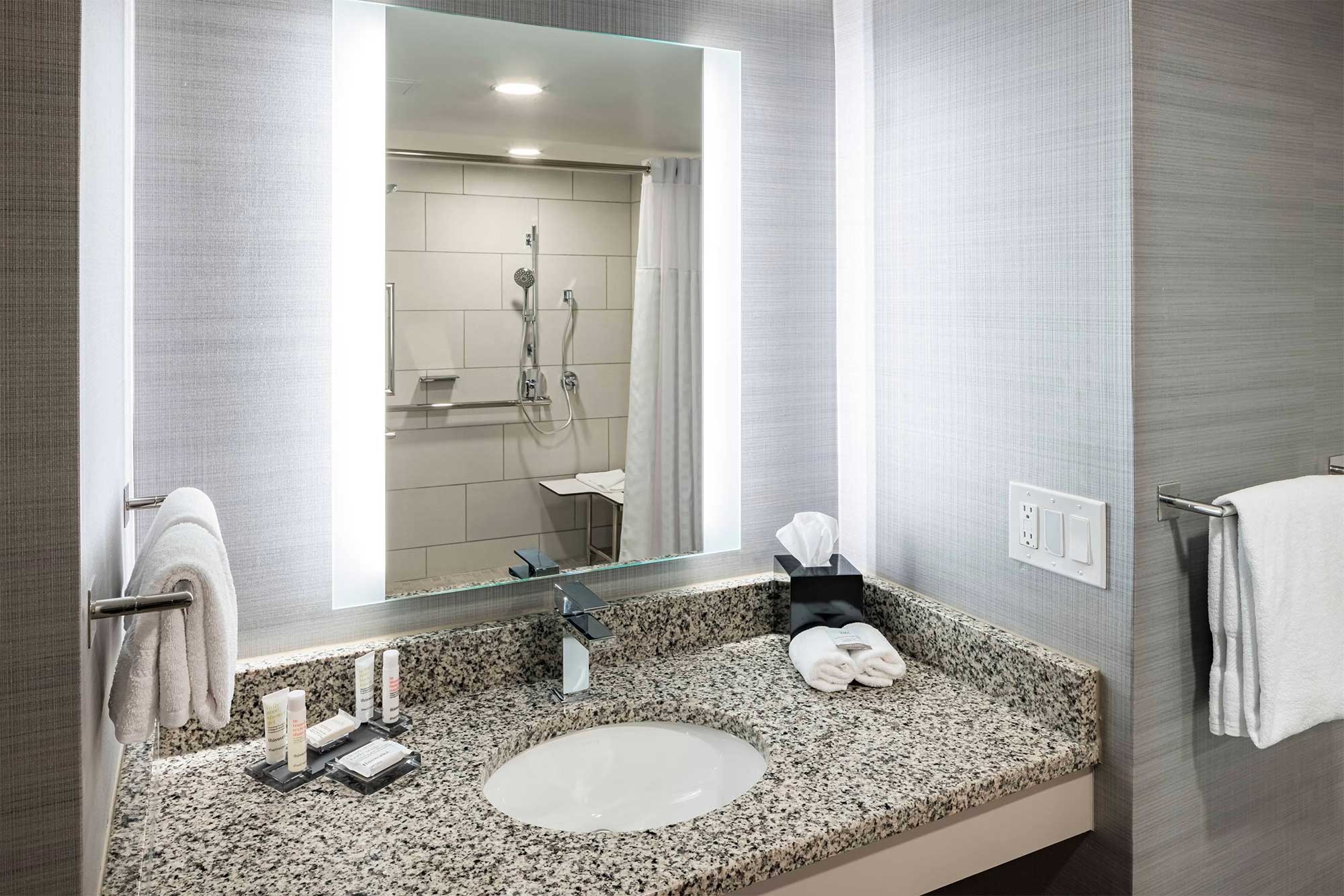 - Moxy Richmond Downtown — This hip downtown hotel features guest rooms with ADA accessible roll-in showers located at the center of the city.