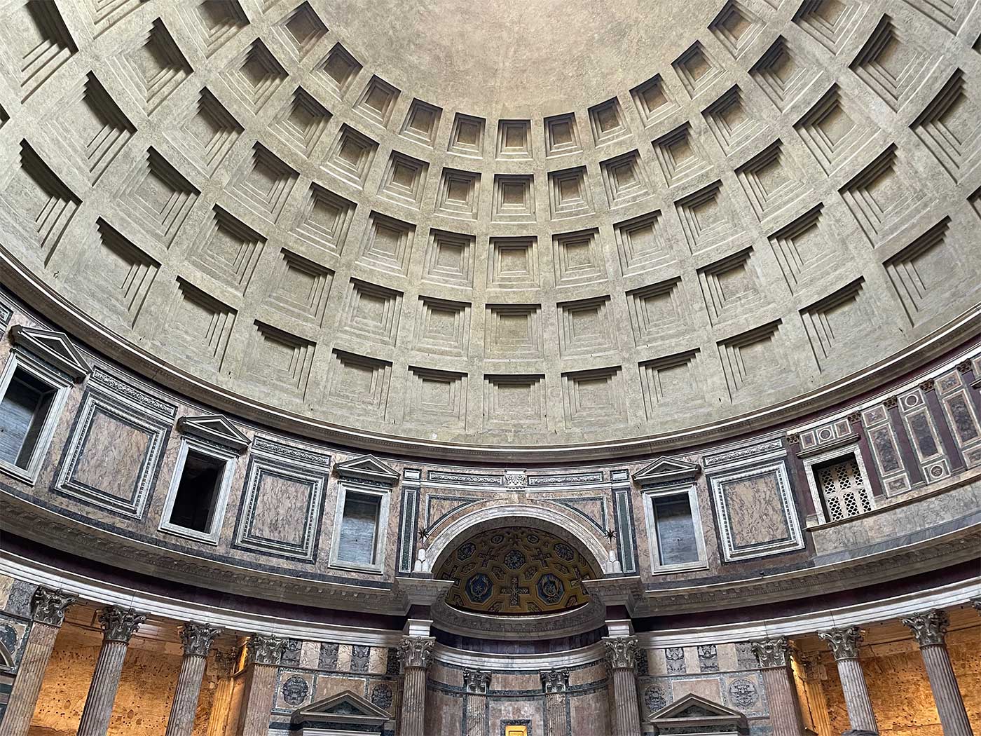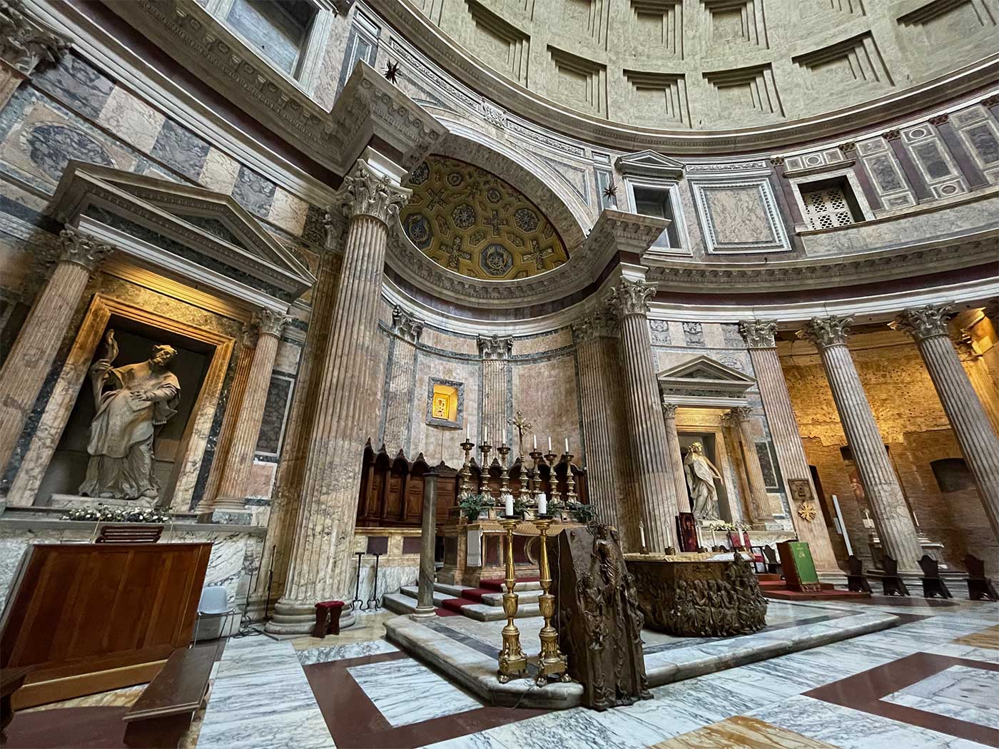 The interior design and architectural elements are awe-inspiring. The dome features an oculus at its apex, allowing natural light to illuminate the Pantheon’s interior. A Catholic high altar, commissioned by Pope Clement XI in the 18th century, draws the attention of visitors. Catholic Masses are still held inside the Pantheon on Sundays and holy days of obligation.