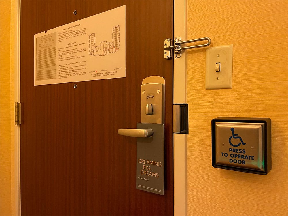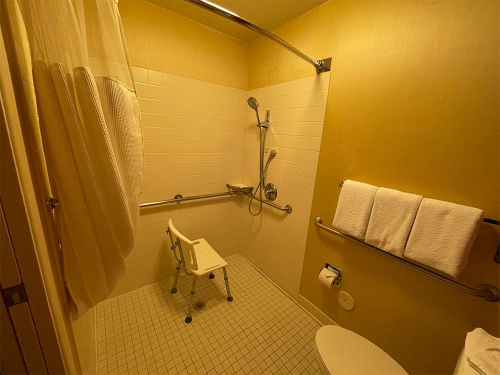 Although the roll-in shower did not have a built-in shower seat, the toilet was accessible and the room had an electronic door controlled with the press of a button. I unfortunately forgot to measure the room’s features, but would estimate the bed height at 28 inches.