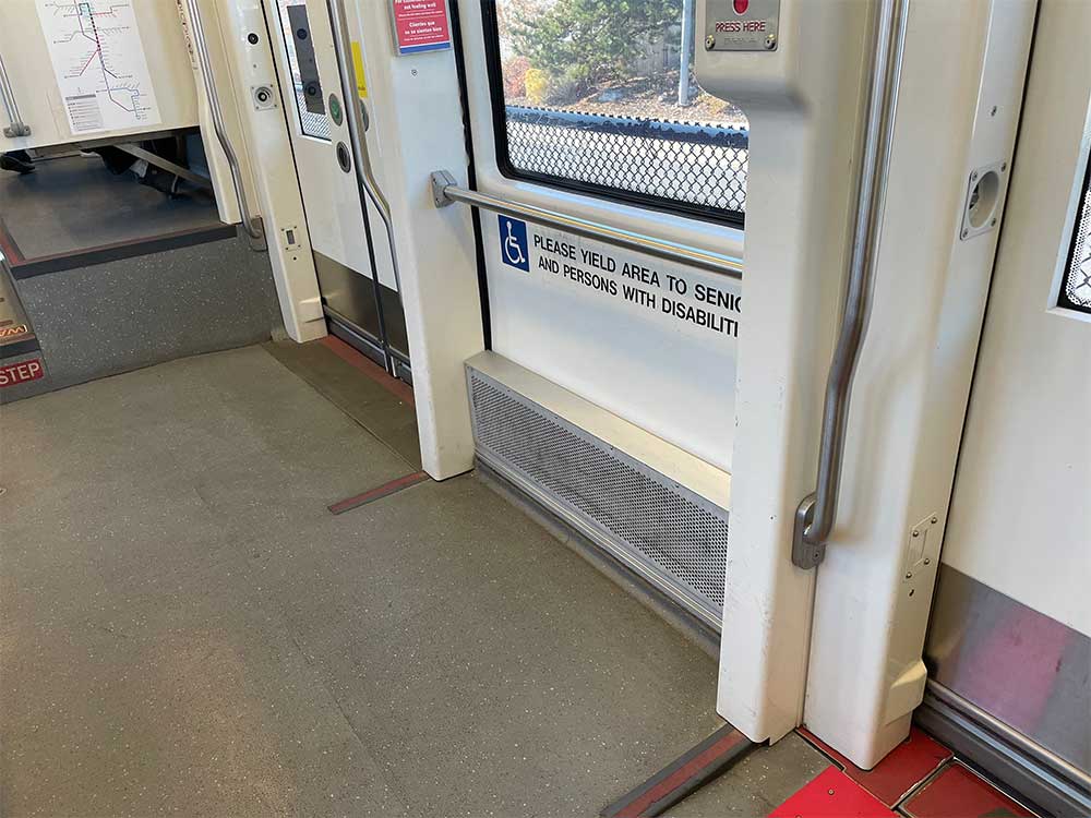 The Red and Green Lines use modern, low -floor trains with a small gap between the train and station platform. Wheelchair users should press the blue button on the train door to activate an automated ramp, which will deploy from the train out onto the station platform. Signs in the stations remind travelers of the following: