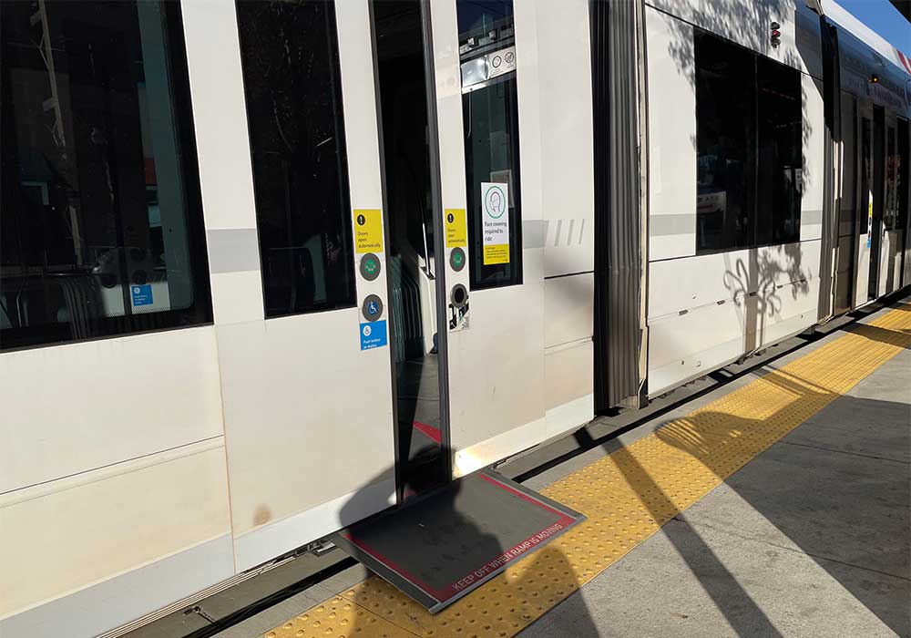 Each TRAX train is wheelchair accessible, but Blue line trains use older, high-floor cars with steps. Each Blue line station has a ramp for wheelchair users and people with limited mobility, located at the front of the platform. Disabled passengers should wait for the train at the top of the boarding ramp. When the train arrives, its operator will lay out a bridge plate to provide barrier-free access between the high boarding platform and train car.