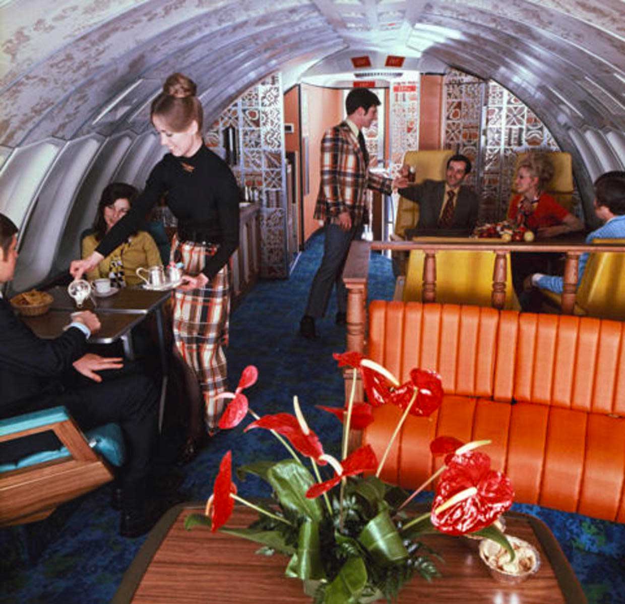 Take the lounge area of United’s first Boeing 747 as an example, which utilized the upper deck not for seating, but as a place for passengers to roam and relax, with sofas, chairs and cocktail tables aplenty.