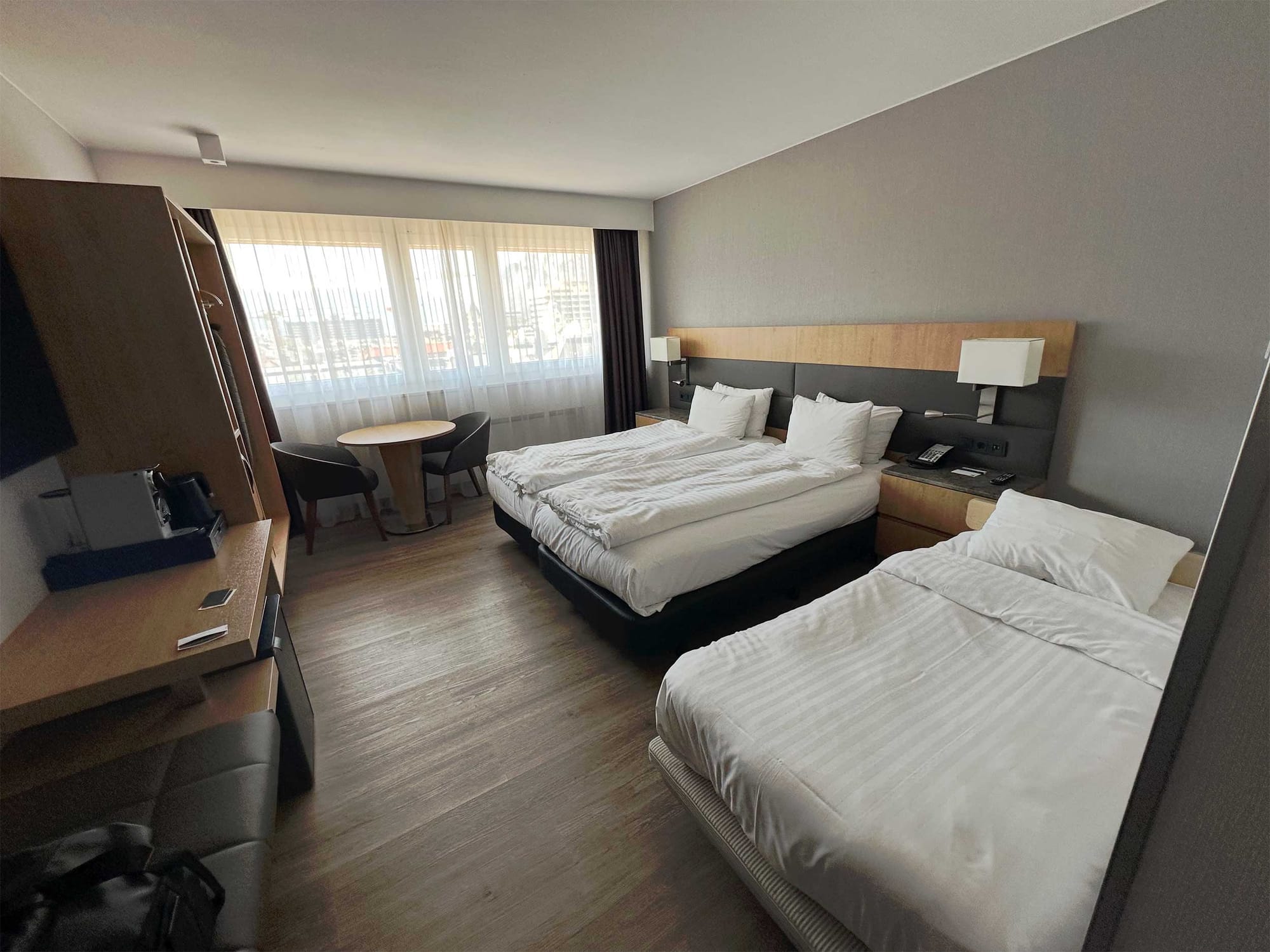The room featured two double (more like, twin-plus) beds which were accessible on all sides. We needed an extra bed for Robert, and the hotel kindly provided a rollaway bed. The third bed fit easily, but the room was cramped with two wheelchairs maneuvering about!