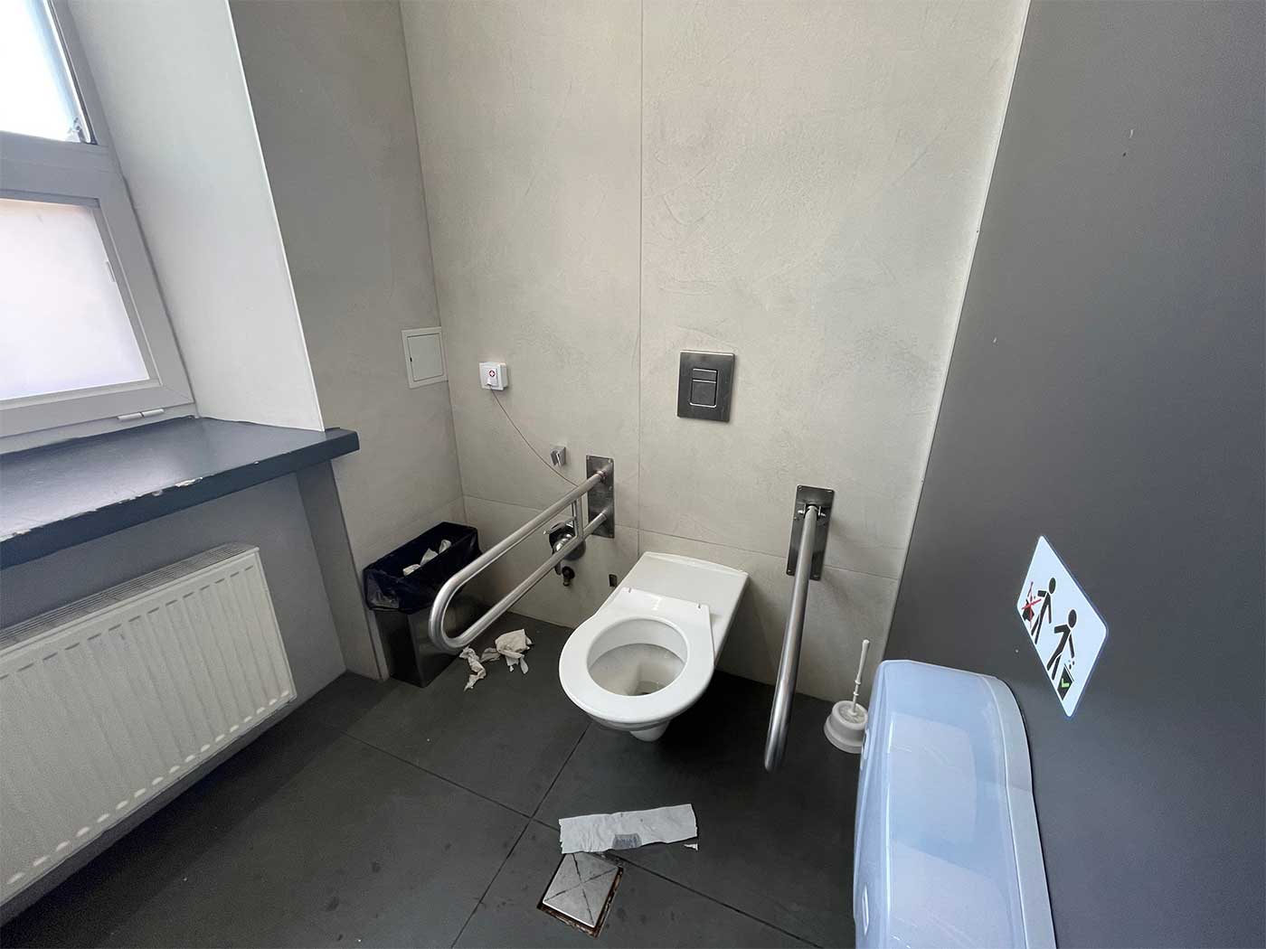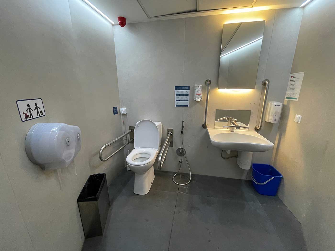 Although the present airport terminal is nearly 75 years old, accessible bathroom facilities do exist and are suited for use by both disabled travelers and their caregivers. The adapted bathrooms feature a toilet with grab bars, roll under sink and more.